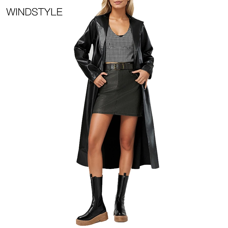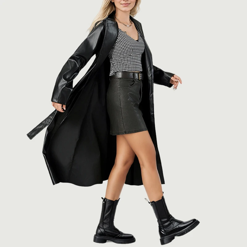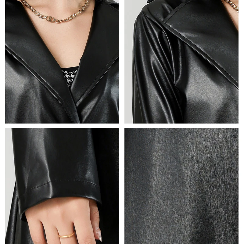 Women's Anti-Wrinkle Windbreaker Fashionable Double-Breasted Leather Coat Polyester Lining Custom Parka Trench Coat Plus Size