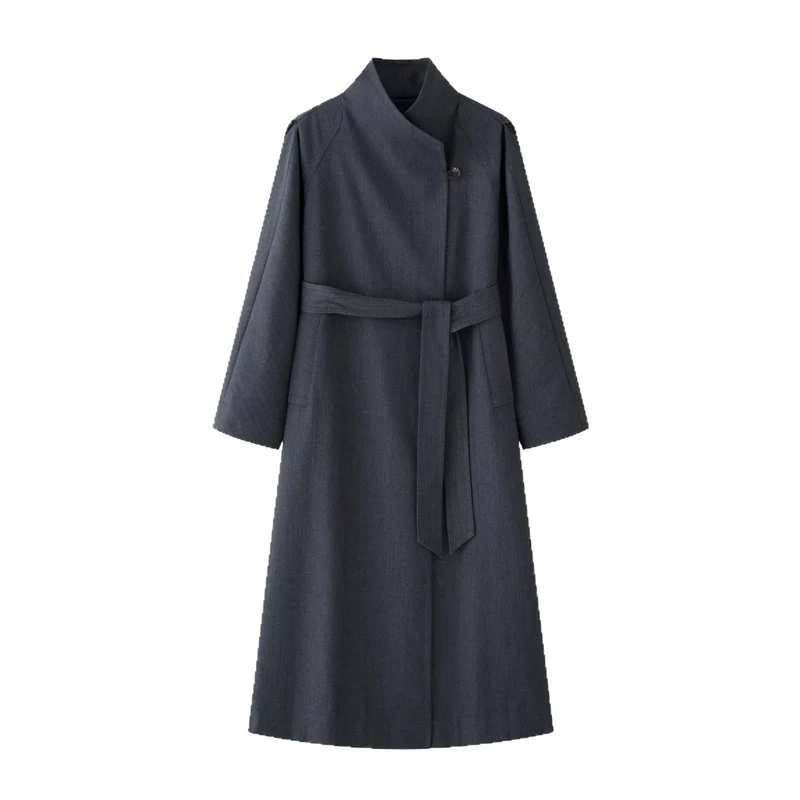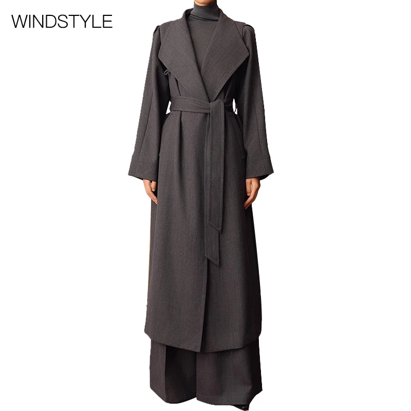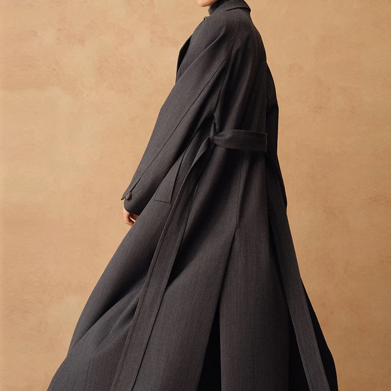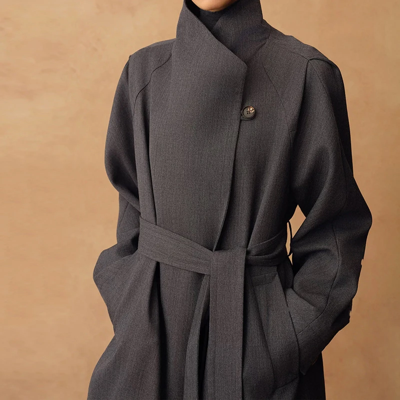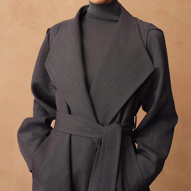 Women's Custom Woolen Texture Two-Wear Air Lapel Blazer Winter Long Coat Lace-Strap Windproof Polyester Lining XS Size Casual