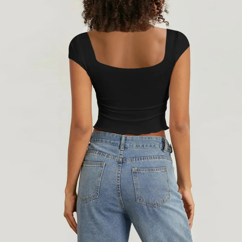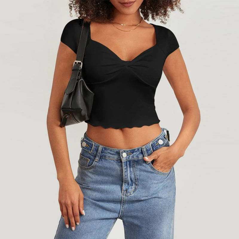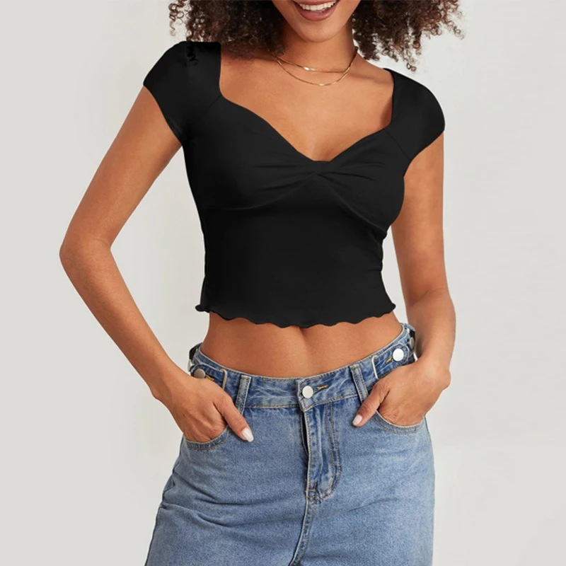 Women's Summer Slim Fit Fashion V-Neck Jacket with Ruffled T-Shirt Breathable and Short Length Solid Pattern