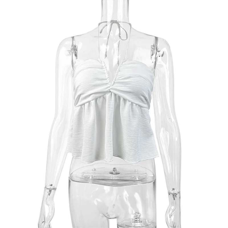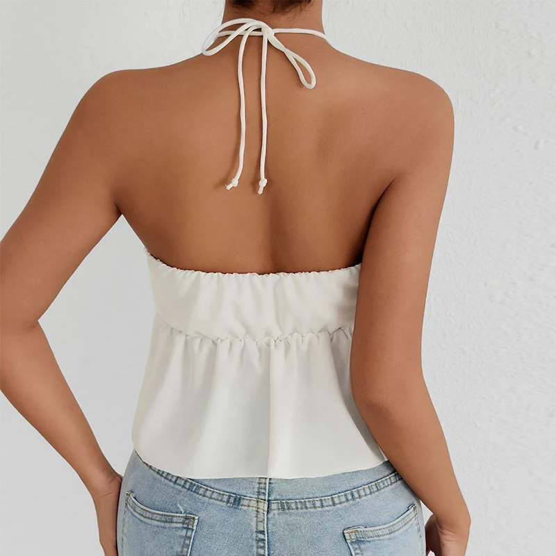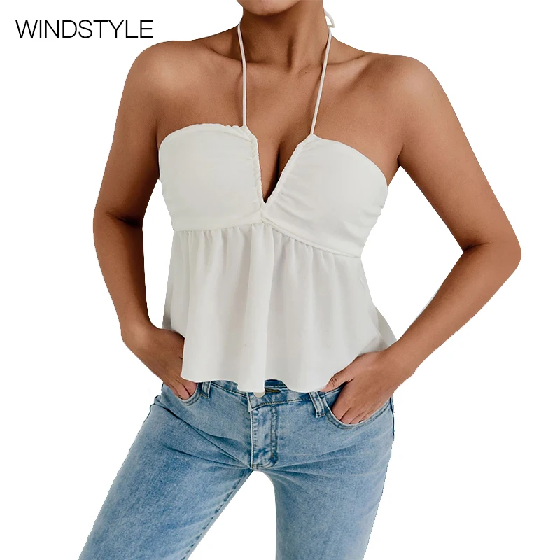 Summer Sexy Women's Slim Deep V Neck Tank Top Spandex Knitted Ruffled Vest with Square Collar Loose Sweet Style Front Logo Print