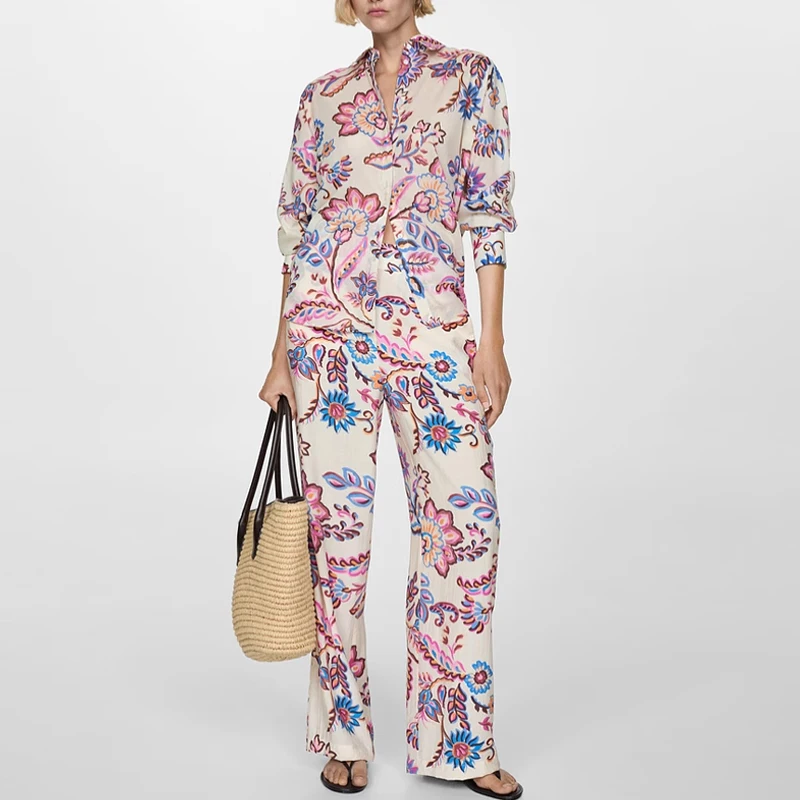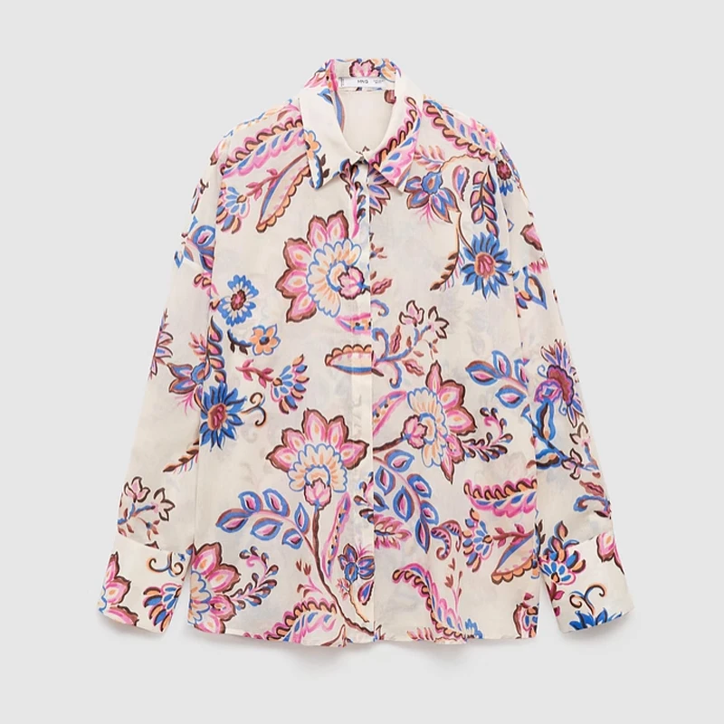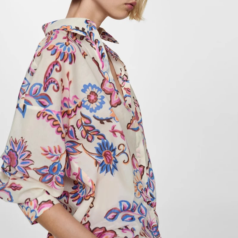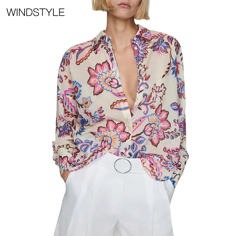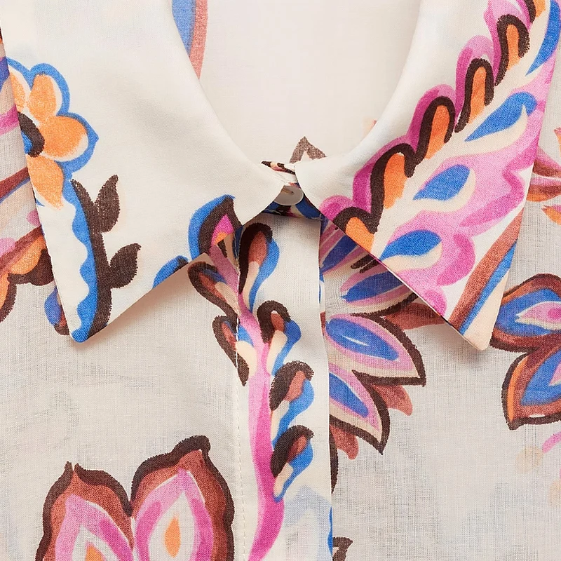 OEM/ODM Long Loose Sleeve Light Beige Floral Print 100% Cotton Blouse Shirt Breathable Embroidered for Summer