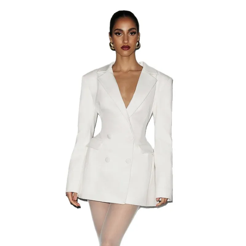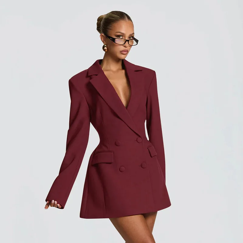New Style Women's Long Double Breasted Button Solid Color V-Neck Slim-waist A-line Polyester/Cotton Blazer Dress