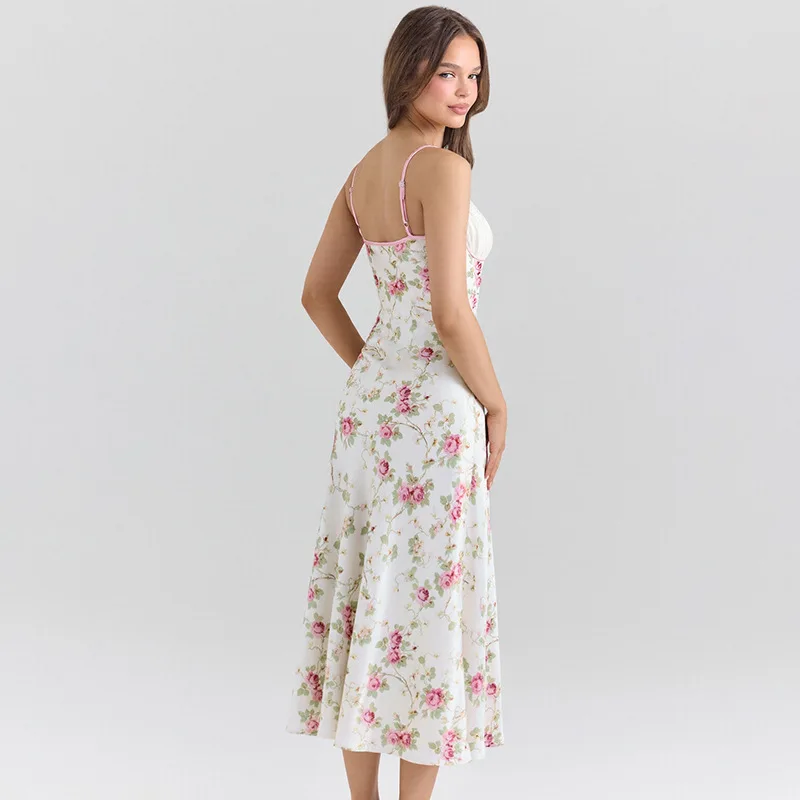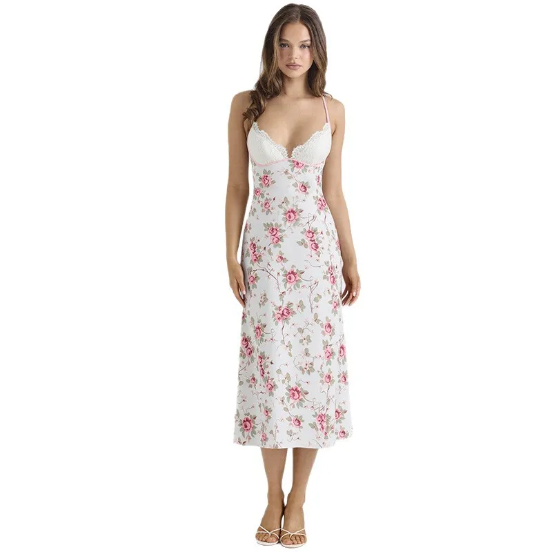 2026 Spring Summer New Fitted Midi Dress Women's Vintage Floral V-neck Lace Trim Sexy Spaghetti Strap Digital Printing