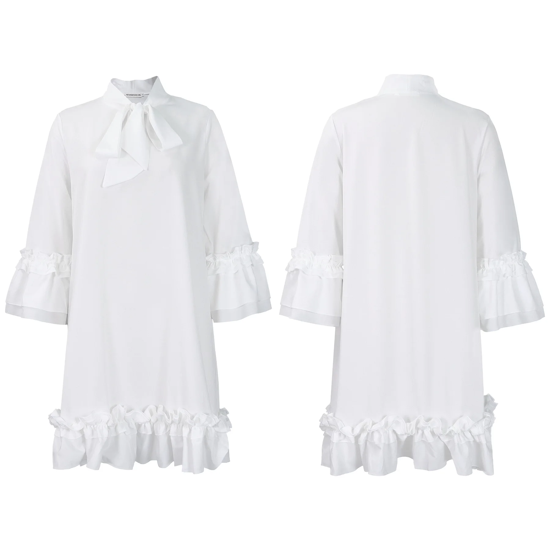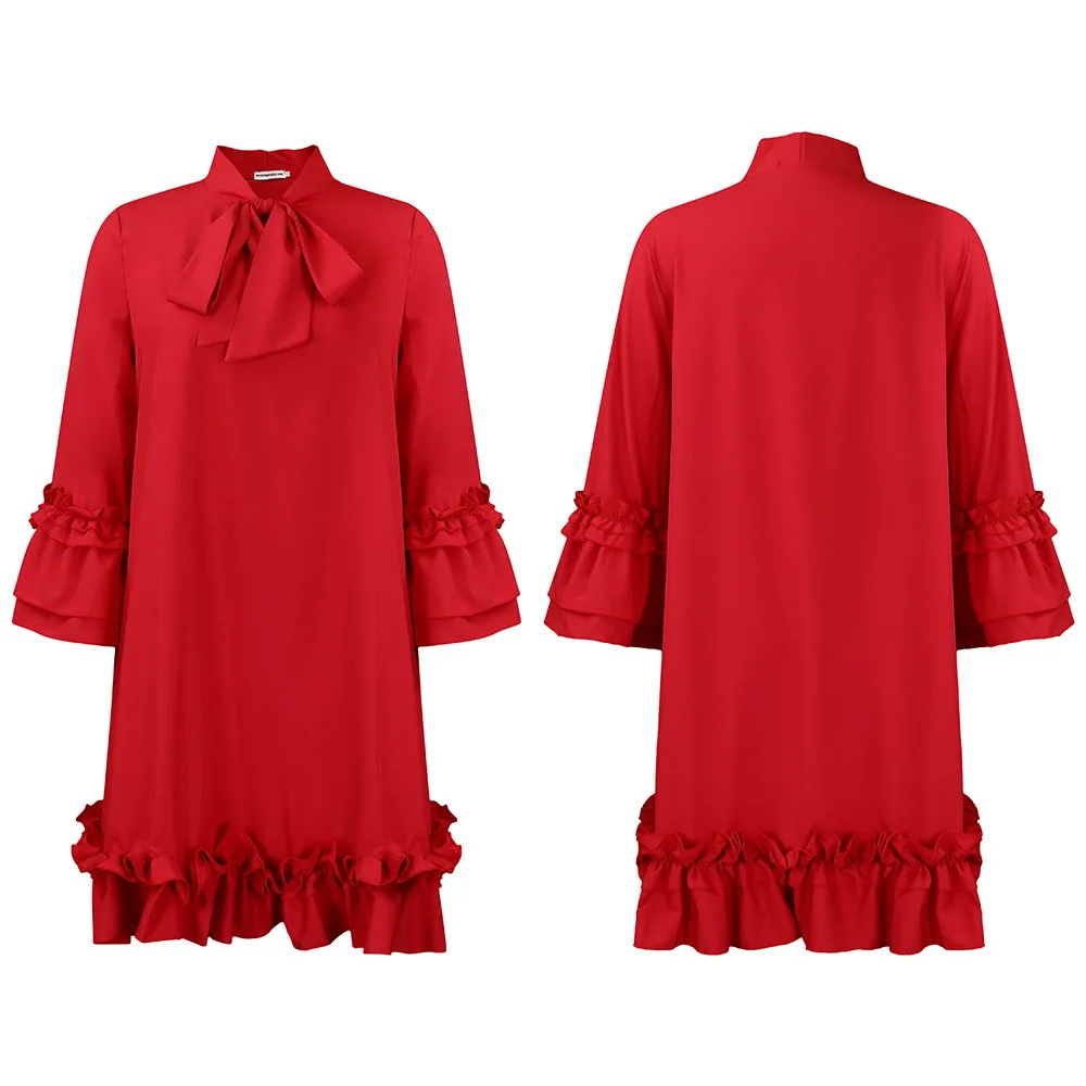 Women's Loose and Casual Plus-size Ruffle Sleeve Tie-up Collar Solid Color Shift Mini Dresses