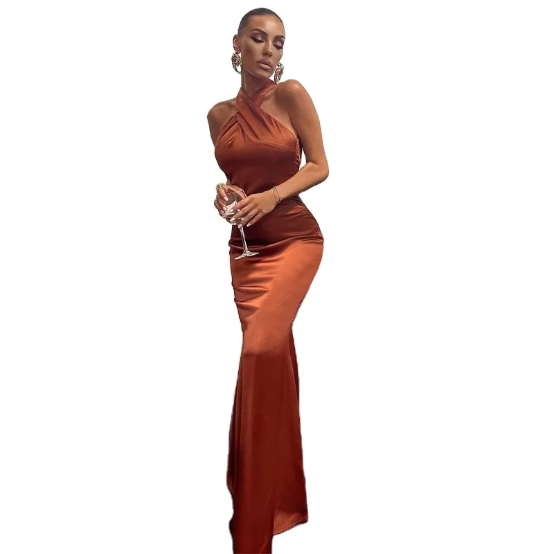 Women's Solid Color Sleeveless Halterneck Slim-fit Sexy Backless Fishtail Maxi Dress Satin Plain Dyed Polyester Spandex Party