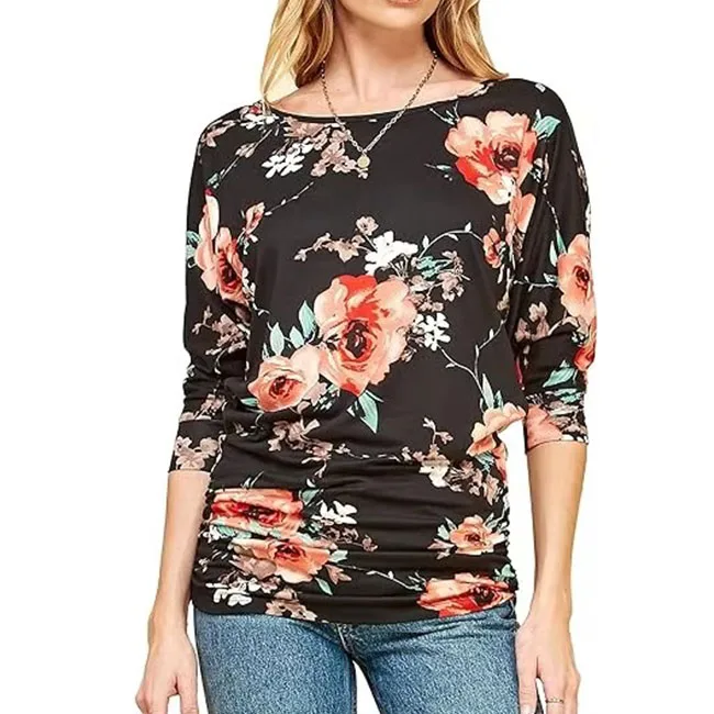 Women's Crew Neck Leg-of-mutton Sleeve Draped Dolman Top/Blouse Side Shirring Premium Knitted Fabric Eco-Friendly Loose Shirt