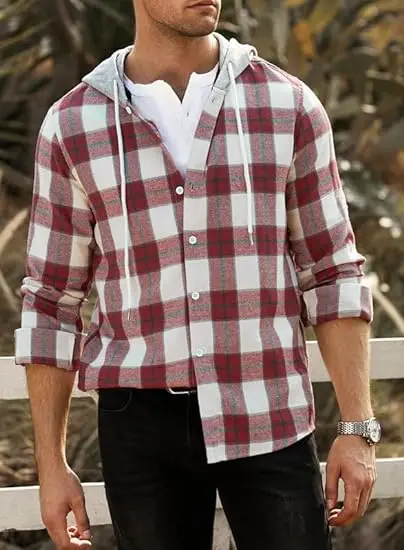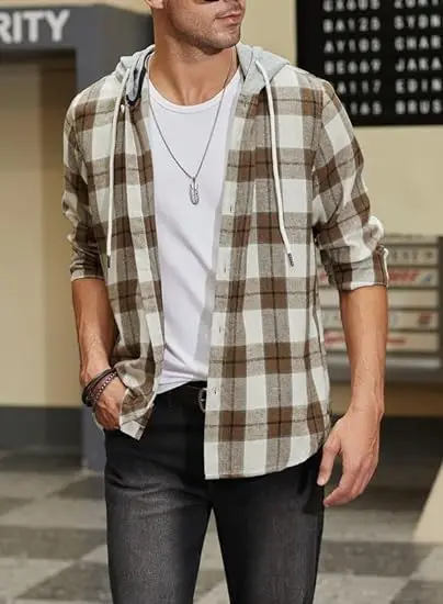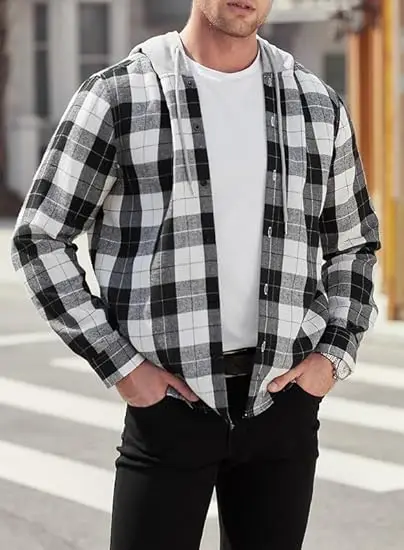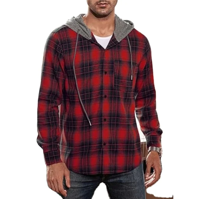 2026 New Design Hooded Eco-Friendly Breathable Flannel Shacket for Men Casual Button Plaid Long Sleeve Lightweight Jackets