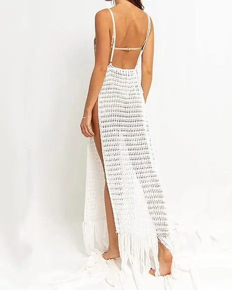 Women's Spaghetti Strap High Waist 100% Polyester Eco-Friendly Crochet Hollow Out Tassels Beach Maxi Swimsuit Coverup Dress