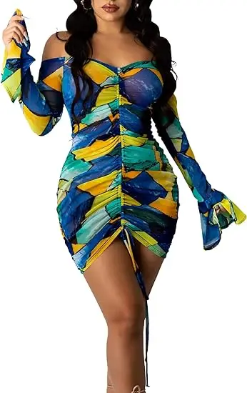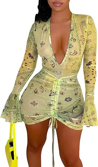 Women's Sheer Chiffon Cover Ups Long Sleeve Pencil Ruched Empire Waist Super Tight Fit Beach Dress for Swimwear