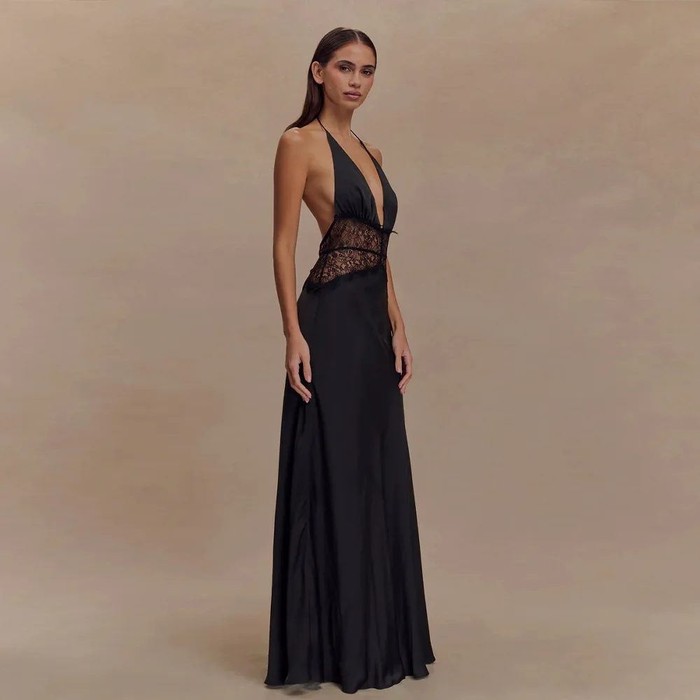 2026 Summer New Design Cut-out Lace Waist Women's Sexy Halter Neck Backless Slim-fit Woven Satin Elegant Party Maxi Dresses