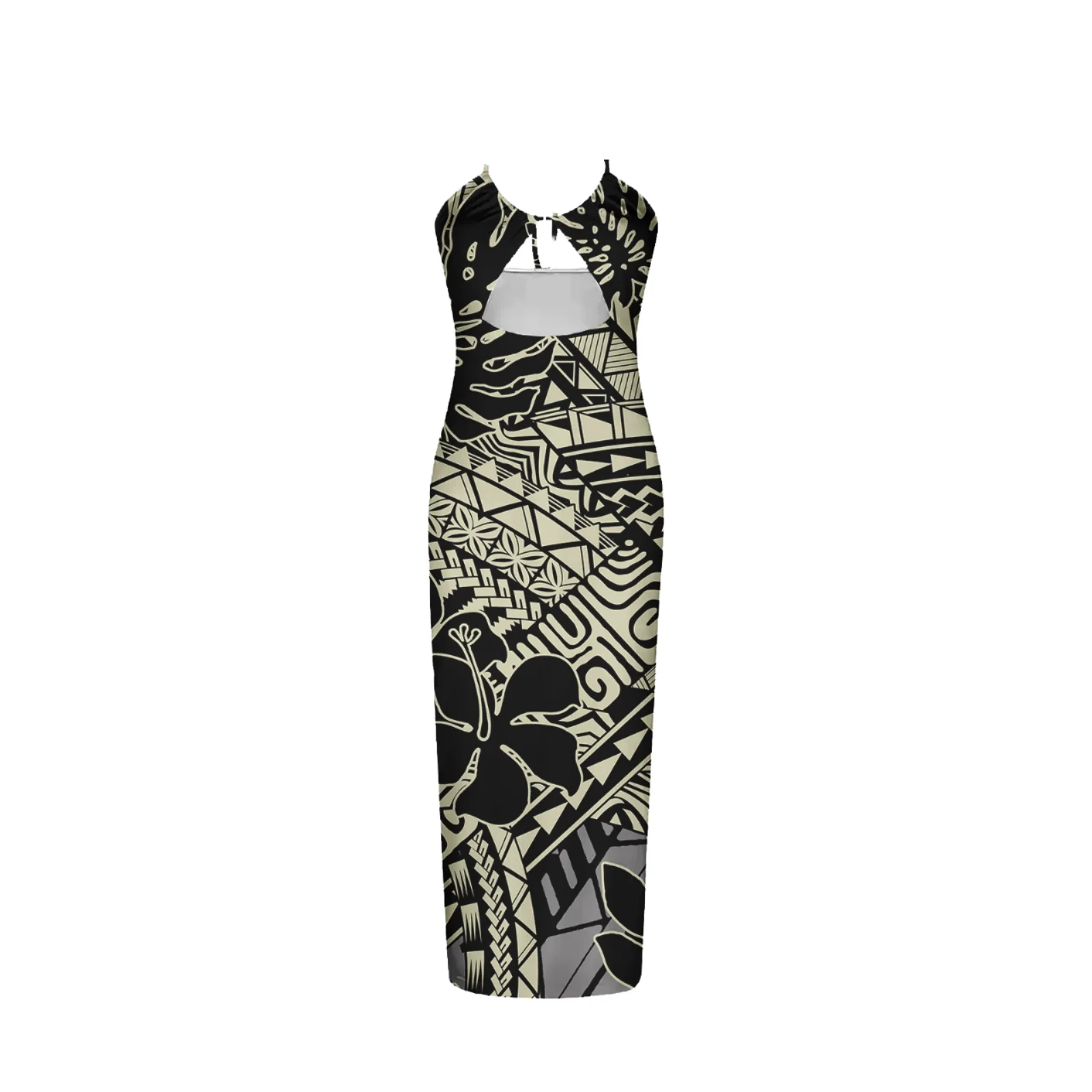 Customizable Breathable Polynesian Puletasi Bodycon Dress Tapa Print Design Halter Hollow Floor-Length Samoan Style Women's