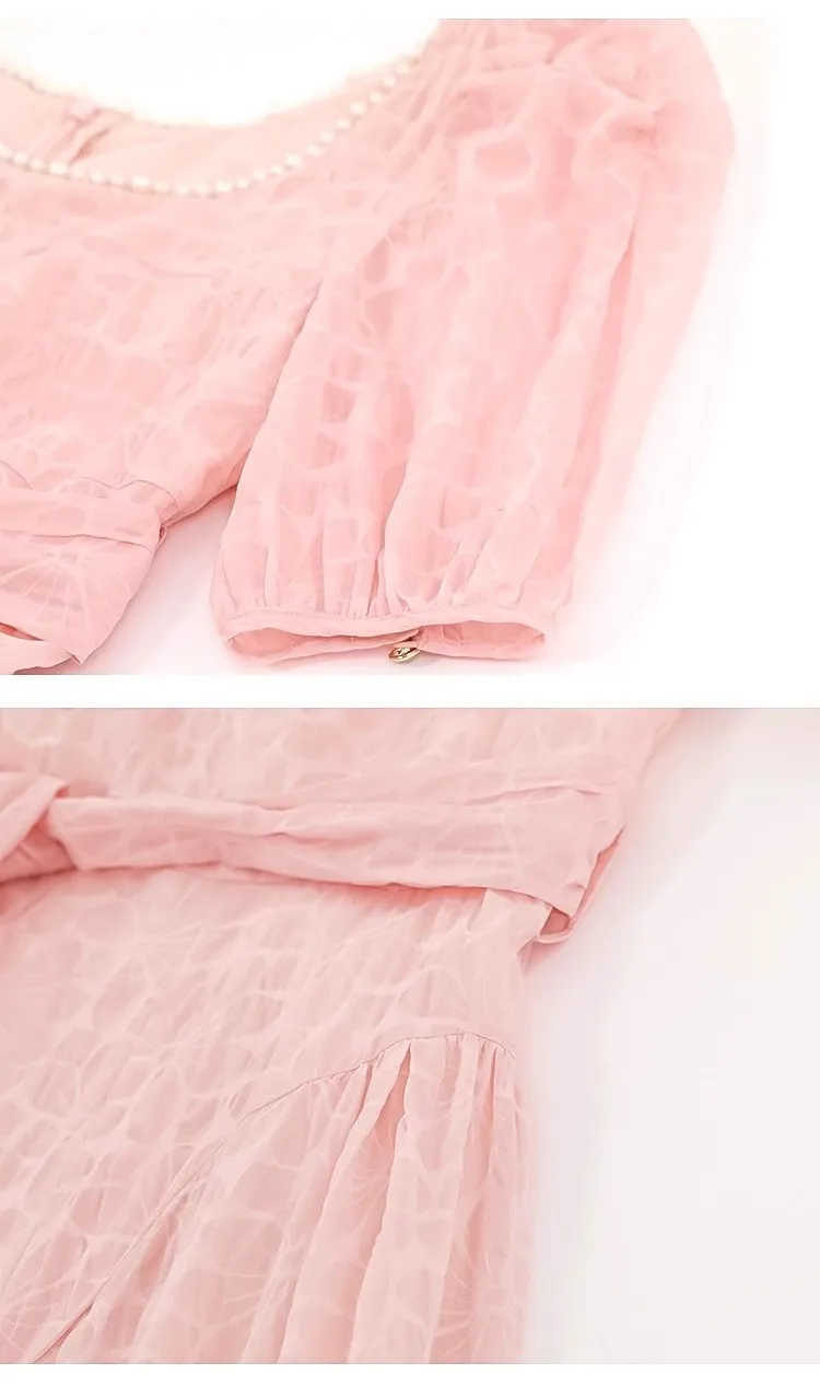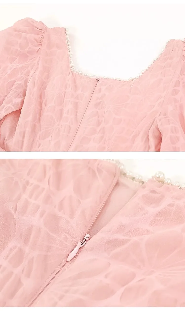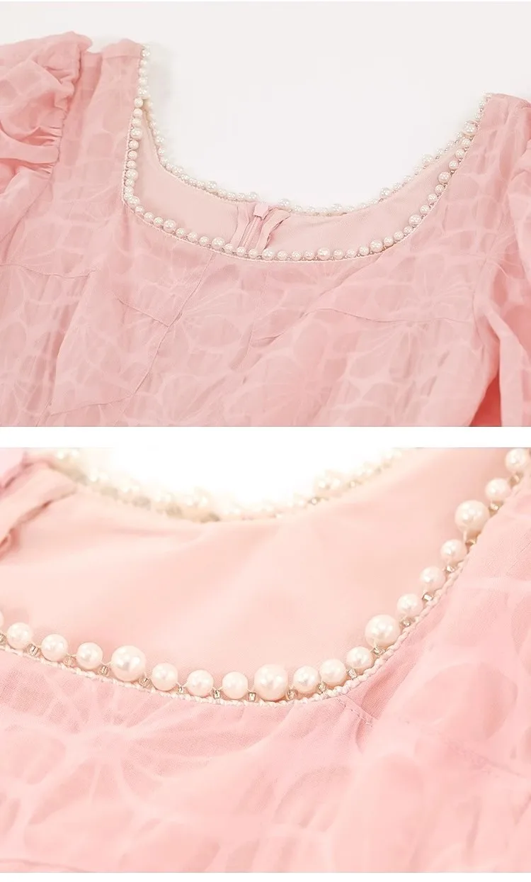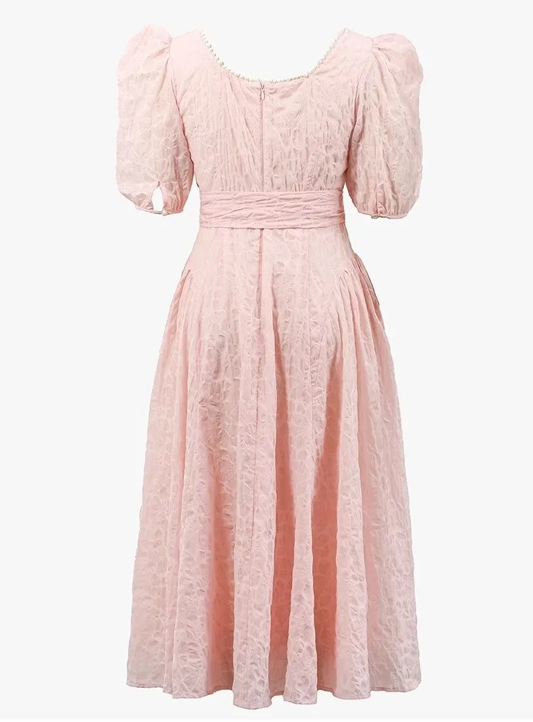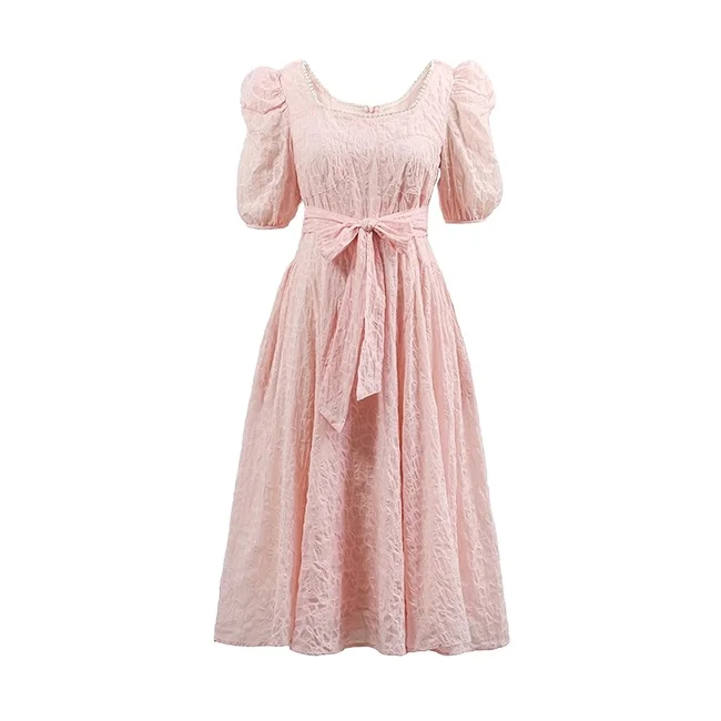 Sweet Bubble Short Sleeve Midi-length Eco-Friendly High Waist Flared Hem Dress Elegant Square Neckline Waist Sash Pink Girls
