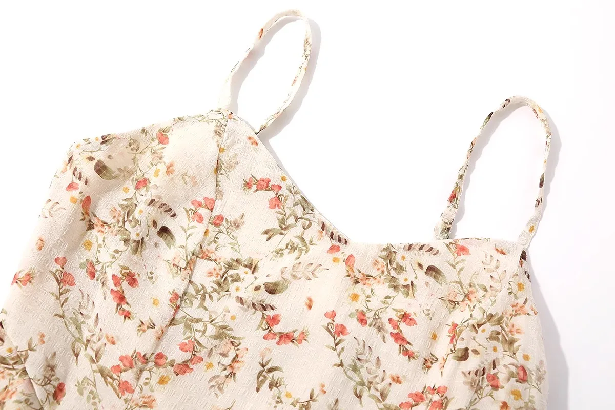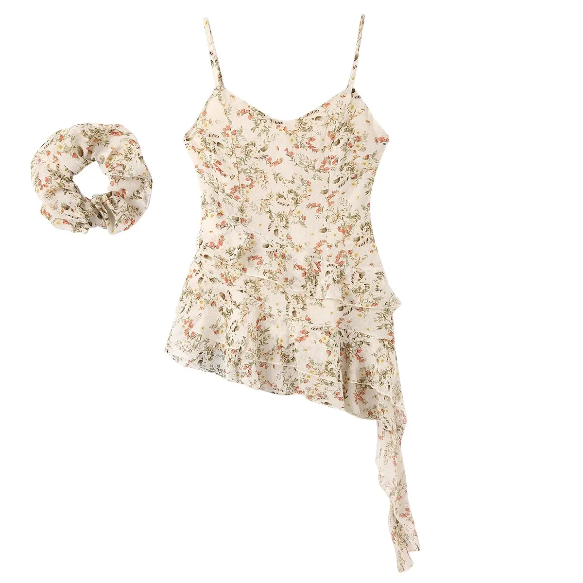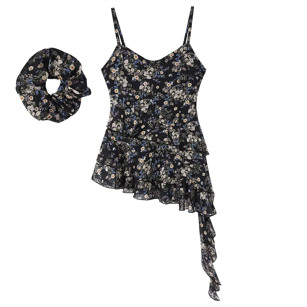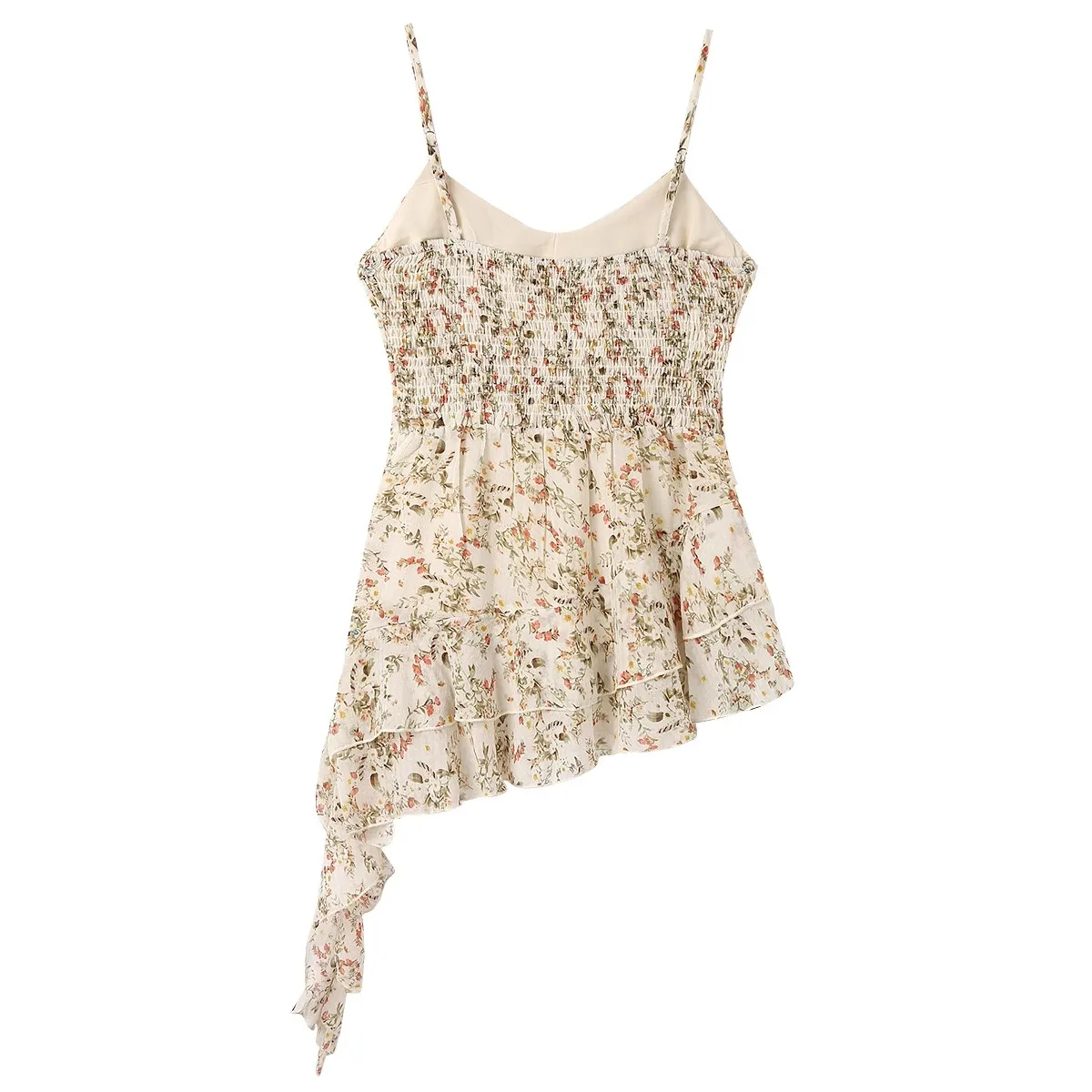 2026 Women's Floral V-neck Spaghetti Strap Tank Top Summer Beach Holiday Casual Wear Asymmetric Ruffle Eco-Friendly Tops