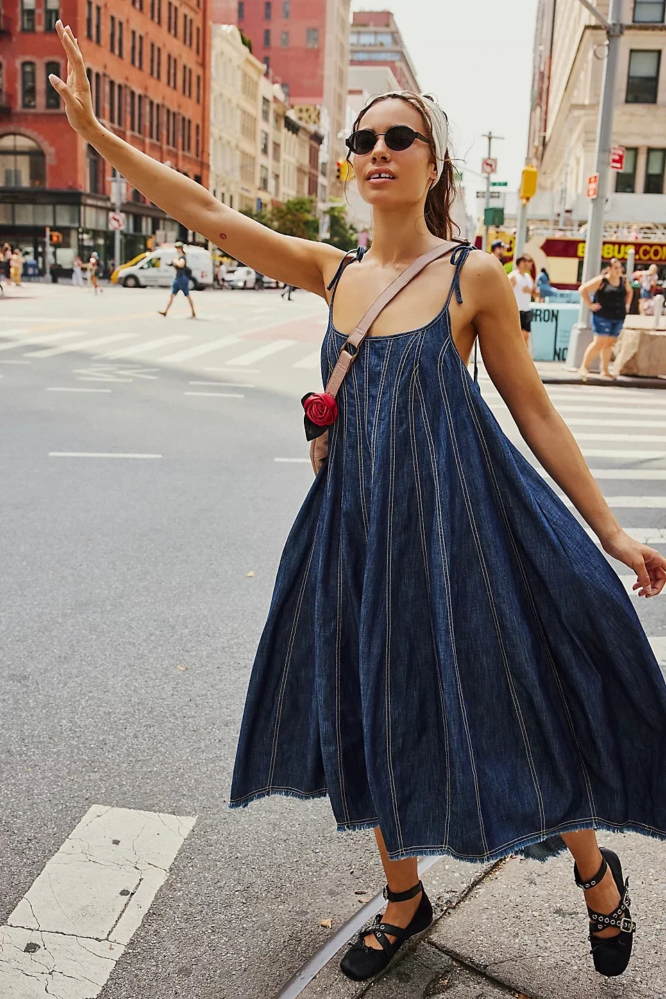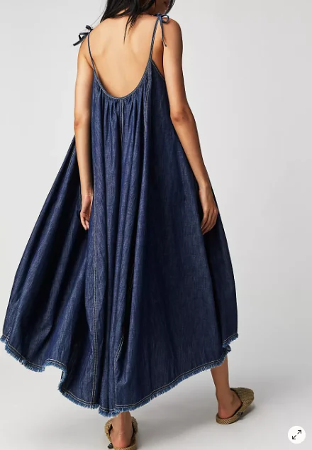 Women's Denim Midi Dress Navy Blue Washed Fashion Sexy Spaghetti Strap Loose Fit Garment Dyed Street Casual Wear Long Dresses