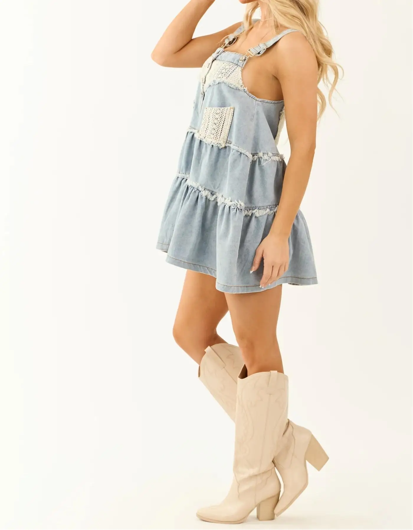 Light Wash Denim Button Suspender A-Line Eco-Friendly 100% Cotton Ruffles Mini Dress