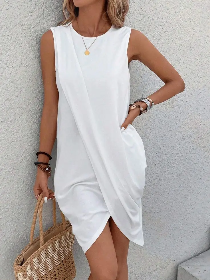 Women's Casual Wear Long T-shirt Dress Short Sleeve Side Ruched Summer Dress White Asymmetrical Loose Mini O-Neck Breathable