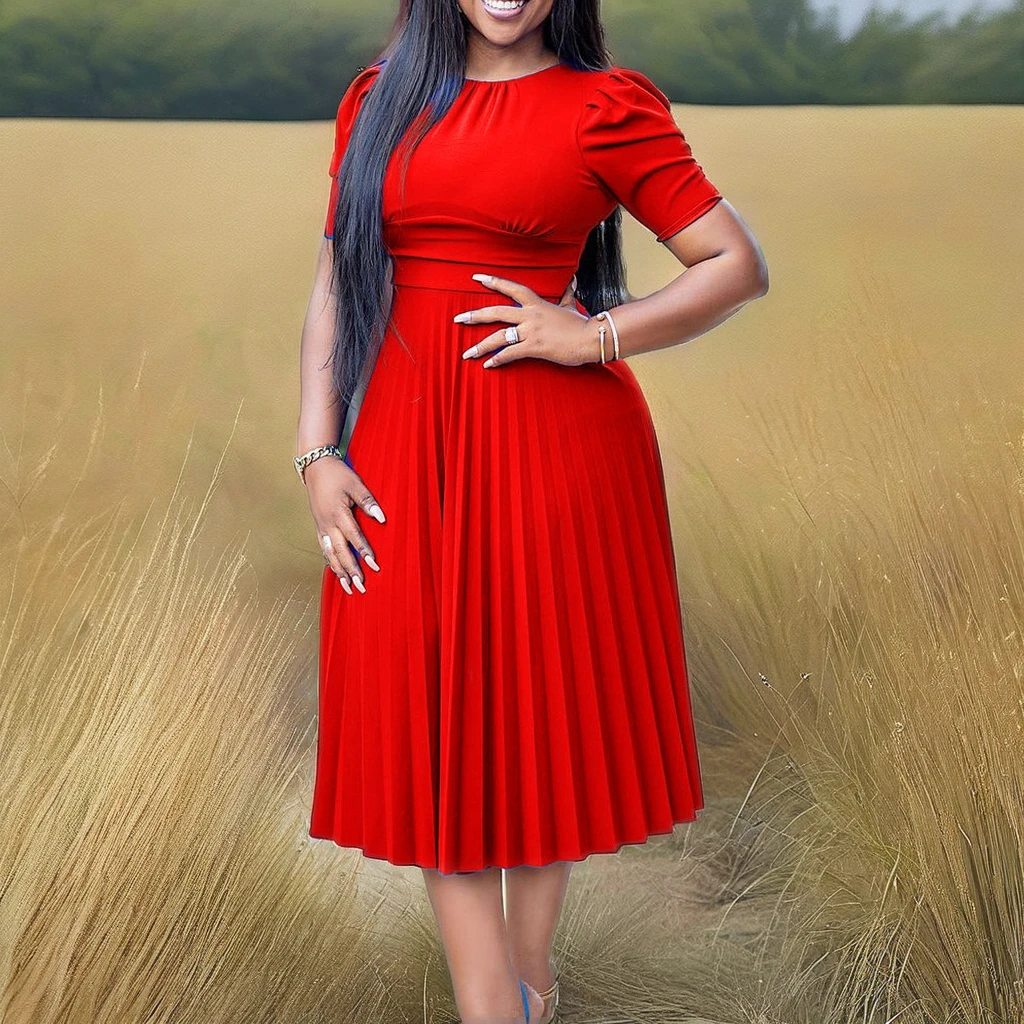 2026 Summer High Street Elegant Ladies Plus-Size Solid A-Line Short-Sleeved Pleated Chiffon Midi Skirt Dress Woven Women