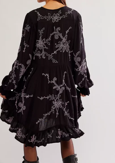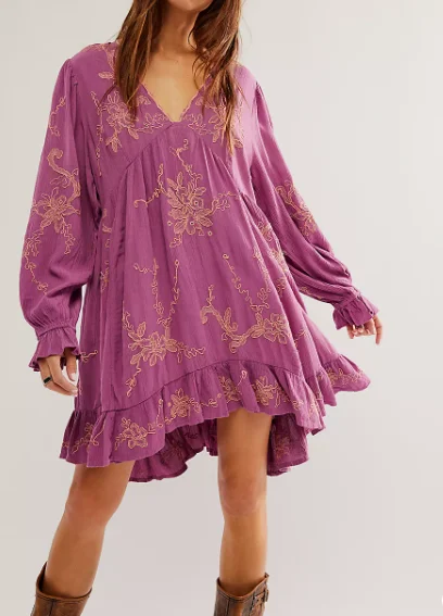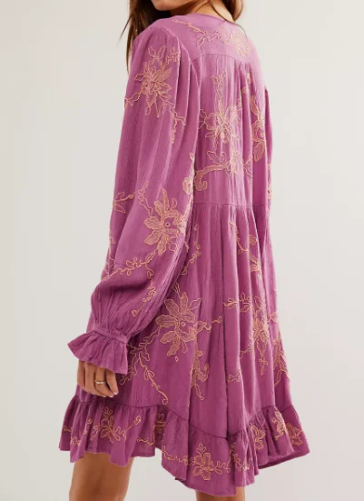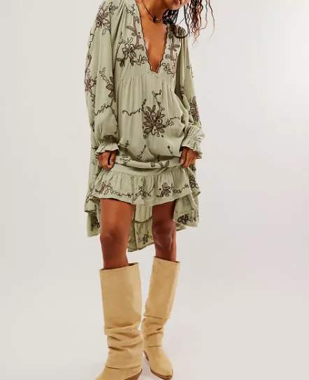 Fashion Women's Custom Made Jacquard Floral Embroidery Breathable Baggy Short Dress Lantern Sleeve V-neck Plus-size Dresses