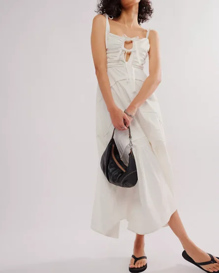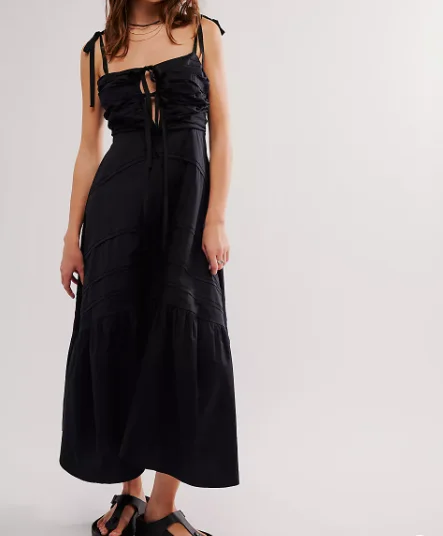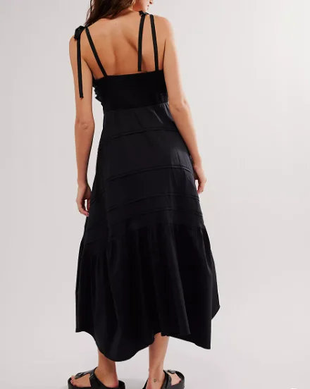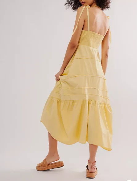 Women's Fashion Summer Dress Tie Front Tiered Skirt Dress Smocked Back Strappy Long Dress