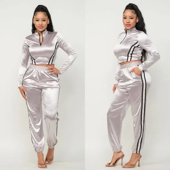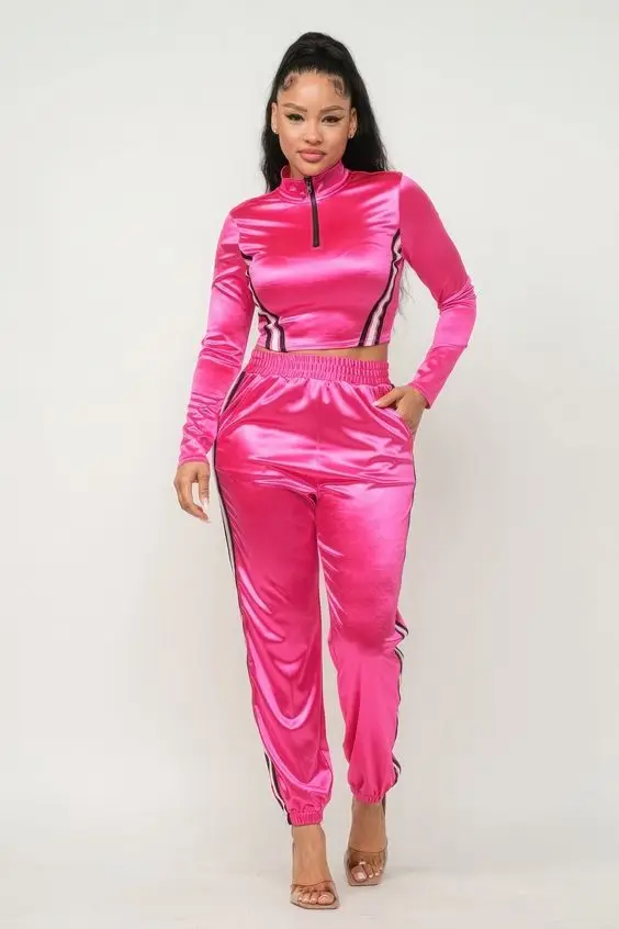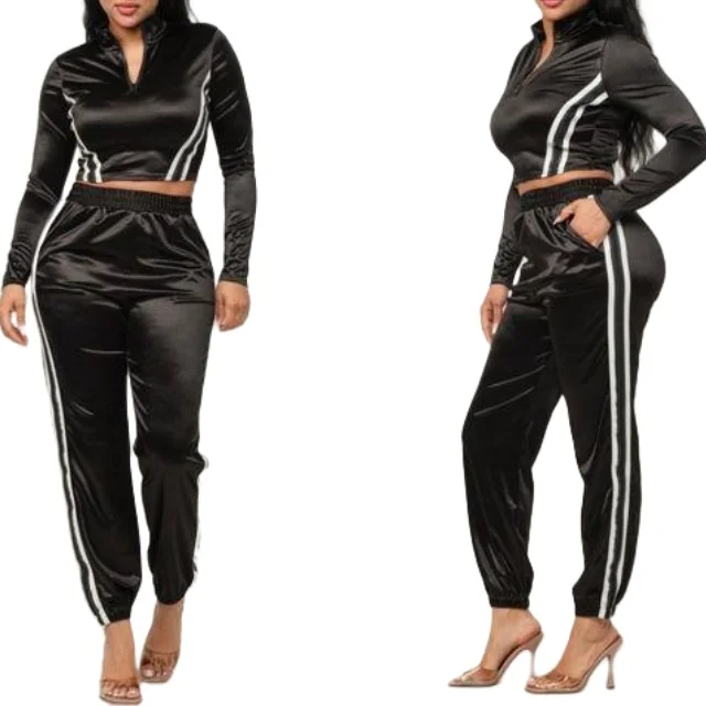 Front Zip Side Stripes Trim Jacket Pants Set Casual Two-Piece Women's Black Sweatsuit Tracksuit Waterproof Breathable Skinny Fit