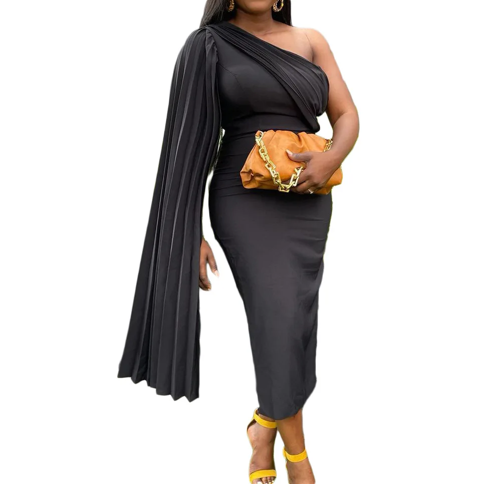Women's Fashion Diagonal Shoulder Pleated Cape Sheath Dress African Plus-Size Midi Length Long Sleeve Chiffon Breathable Dresses
