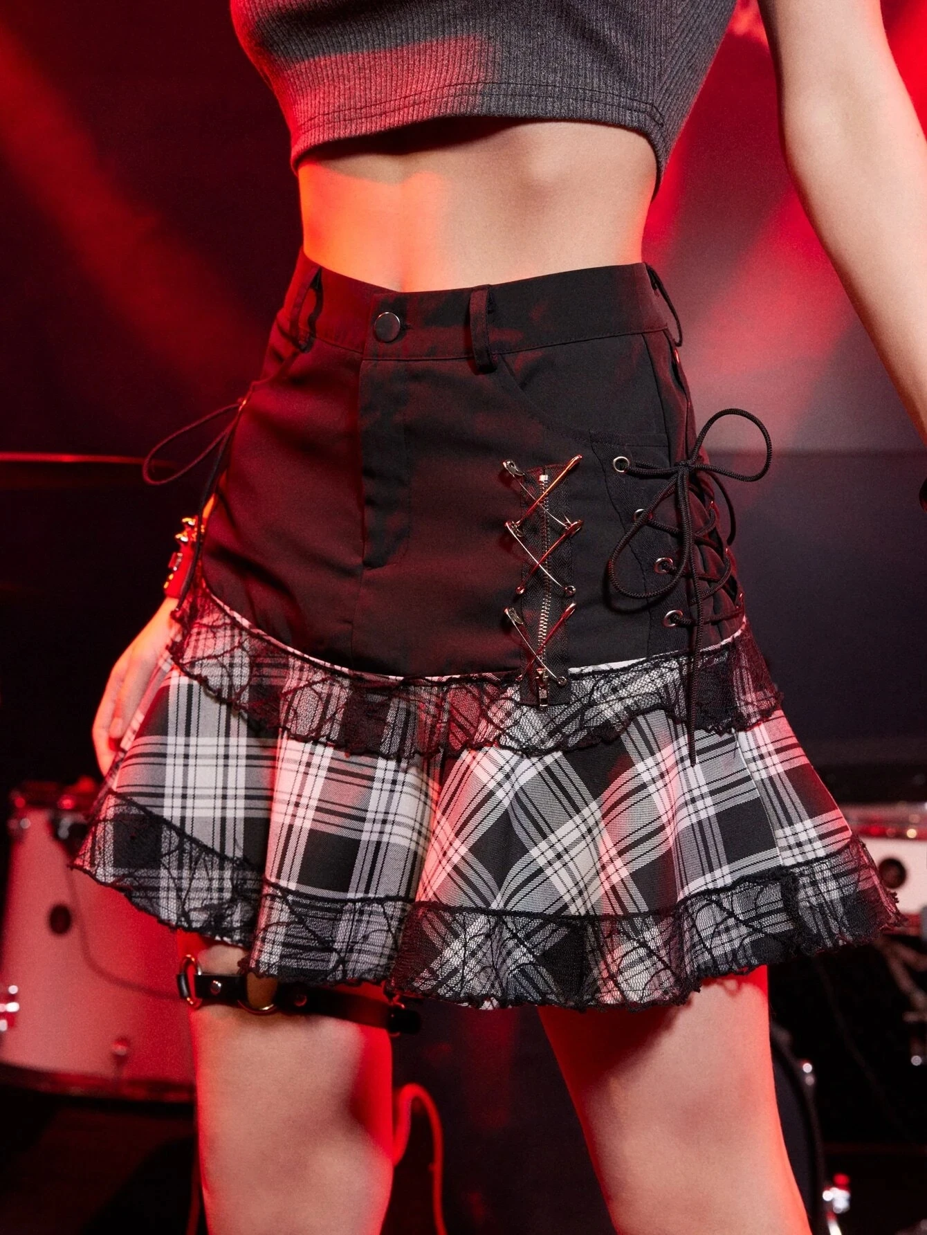 Black Gothic Style Empire Waist A-Line Woven Plaid Patchwork Ruffle Zipper Lace-Up Breathable Eco-Friendly Mini Skirt for Women