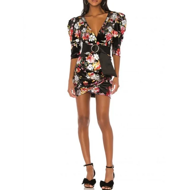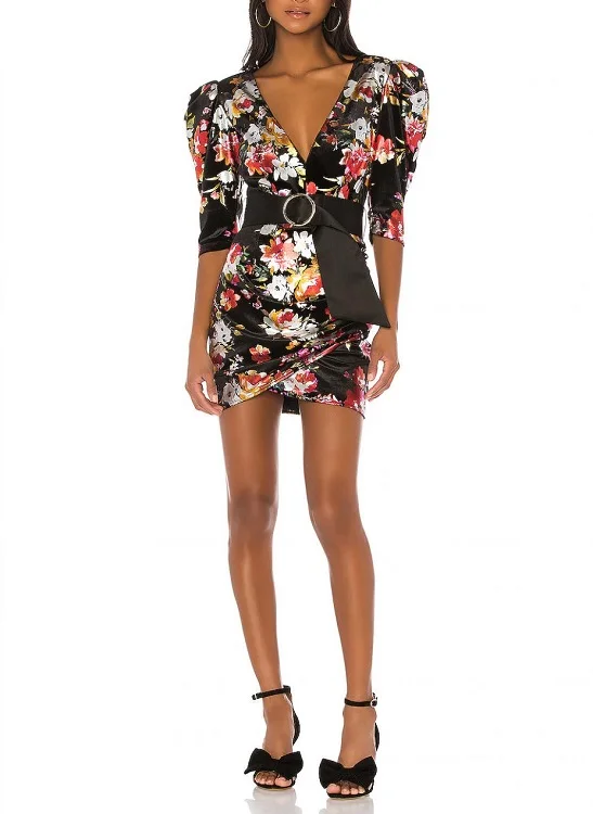Women's Fashion High Street Wear Deep V-neck Short Dress Puff Sleeve Floral Print Belted Tight Mini 100% Polyester Satin