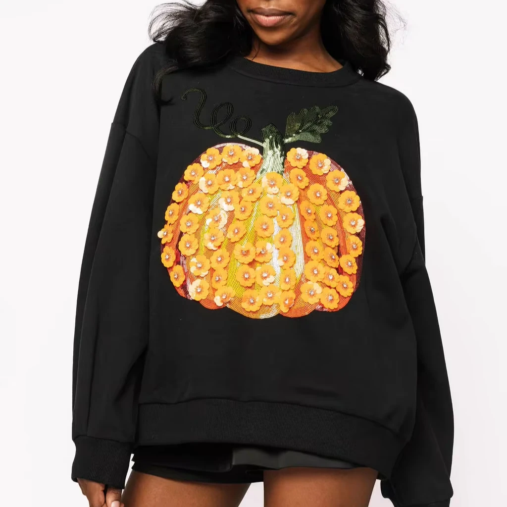 LYG Wholesale Custom New Design Women's Autumn Halloween Pumpkin Sequin Embroidery Floral Eco-Friendly Crewneck Cotton Fashion