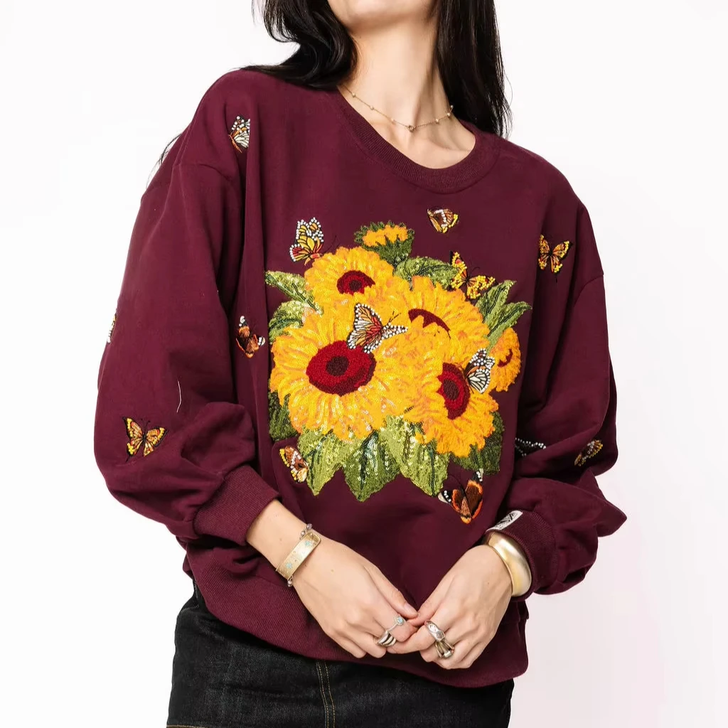 LYG Wholesale Custom New Design Sunflower butterfly Sequin Pattern Embroidery Sweatshirt Crewneck Cotton Fashion Sweatshirt