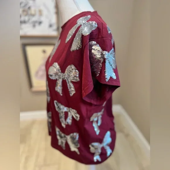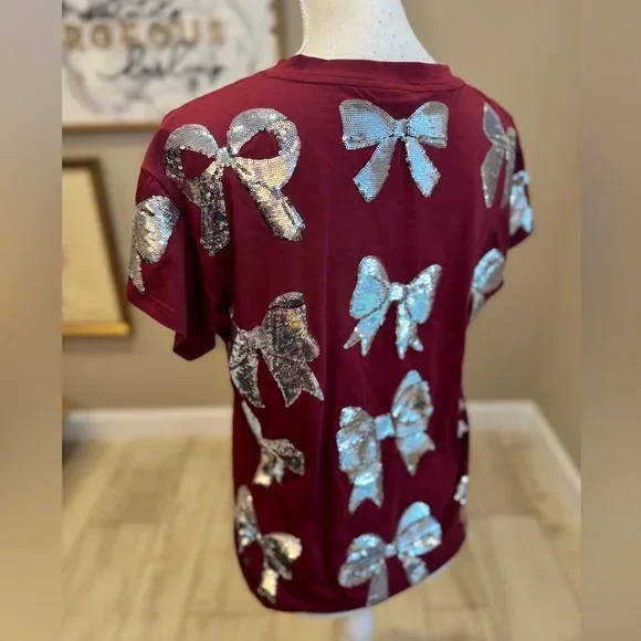 LYG Wholesale Custom New Design Christmas Bow Sequin Party Tee Shirt Crewneck Cotton Fashion T-shirt