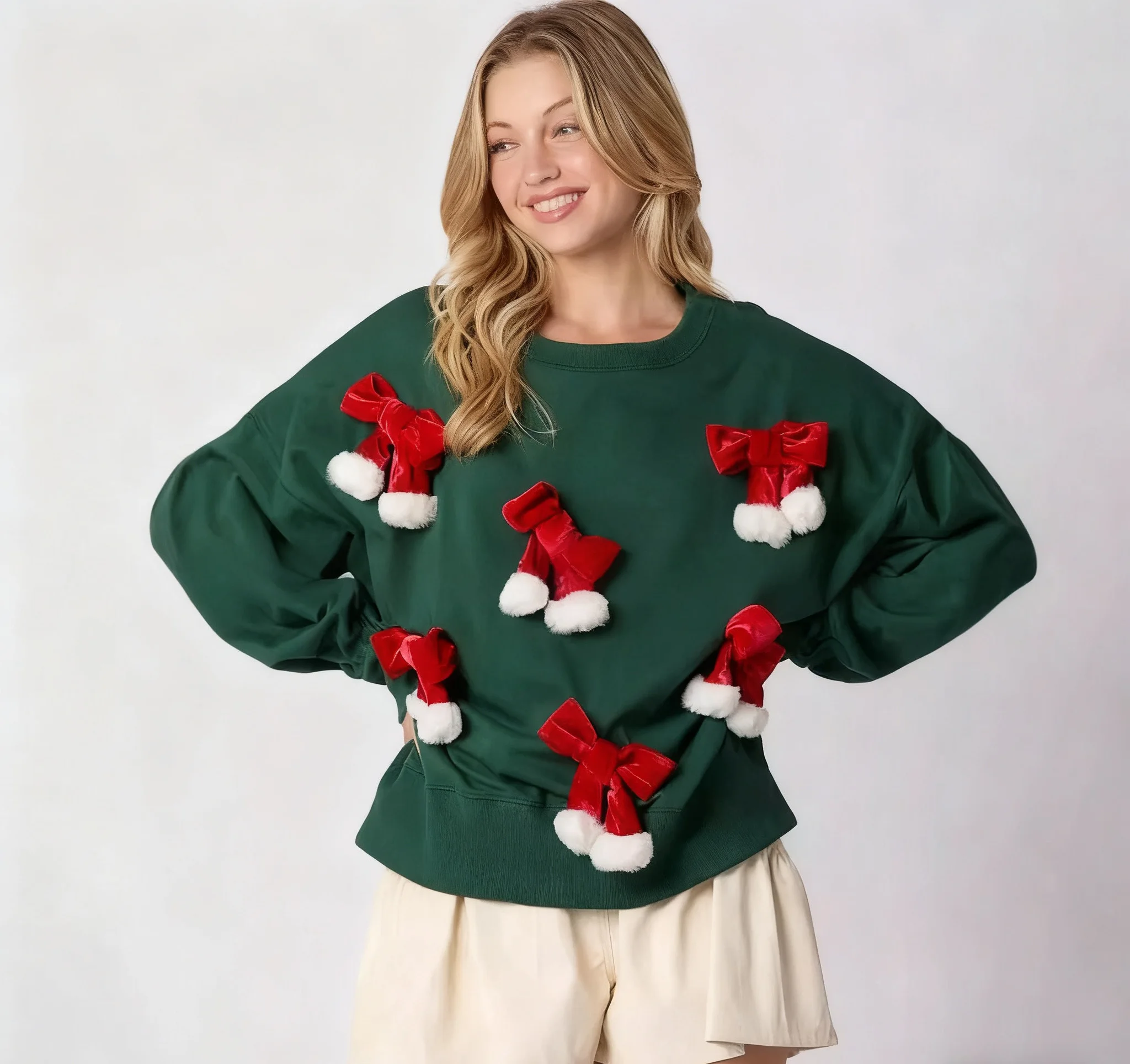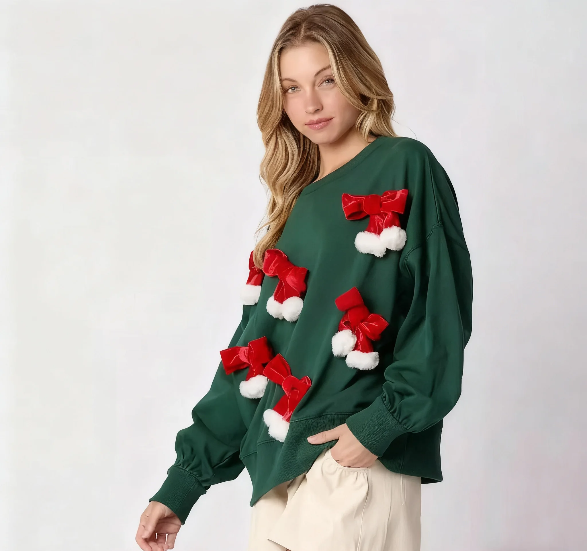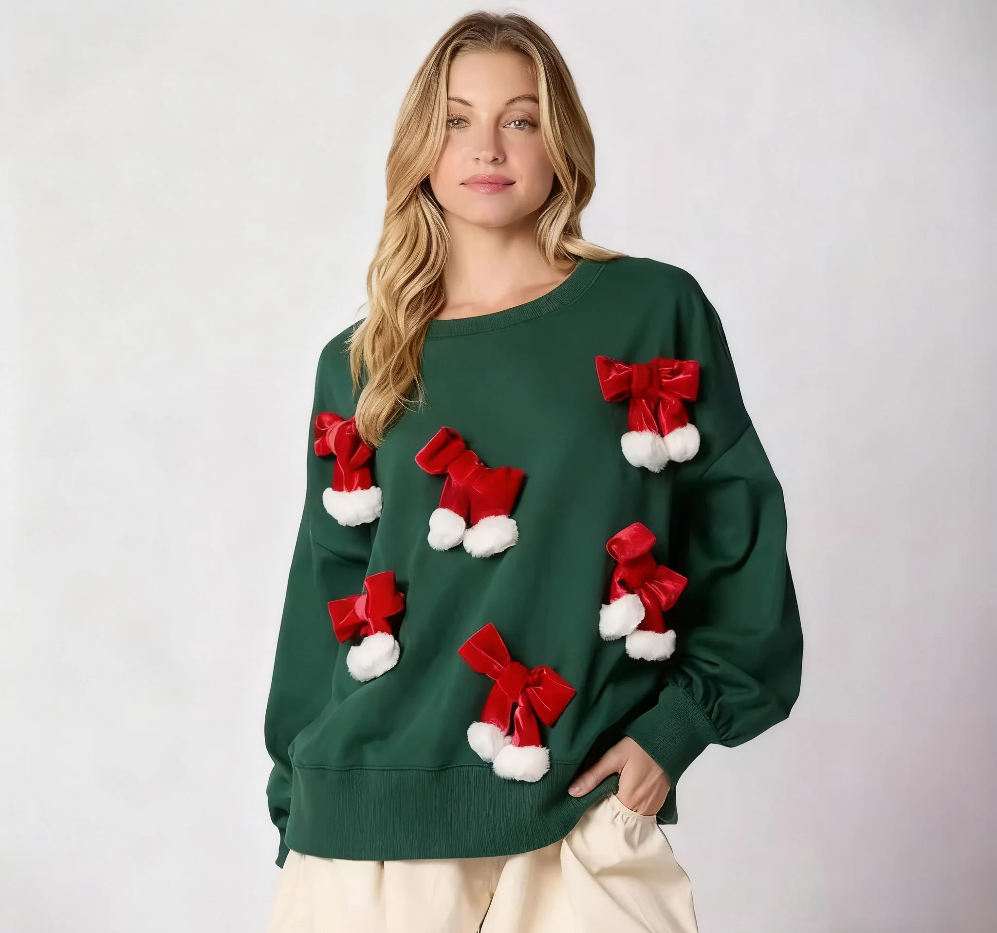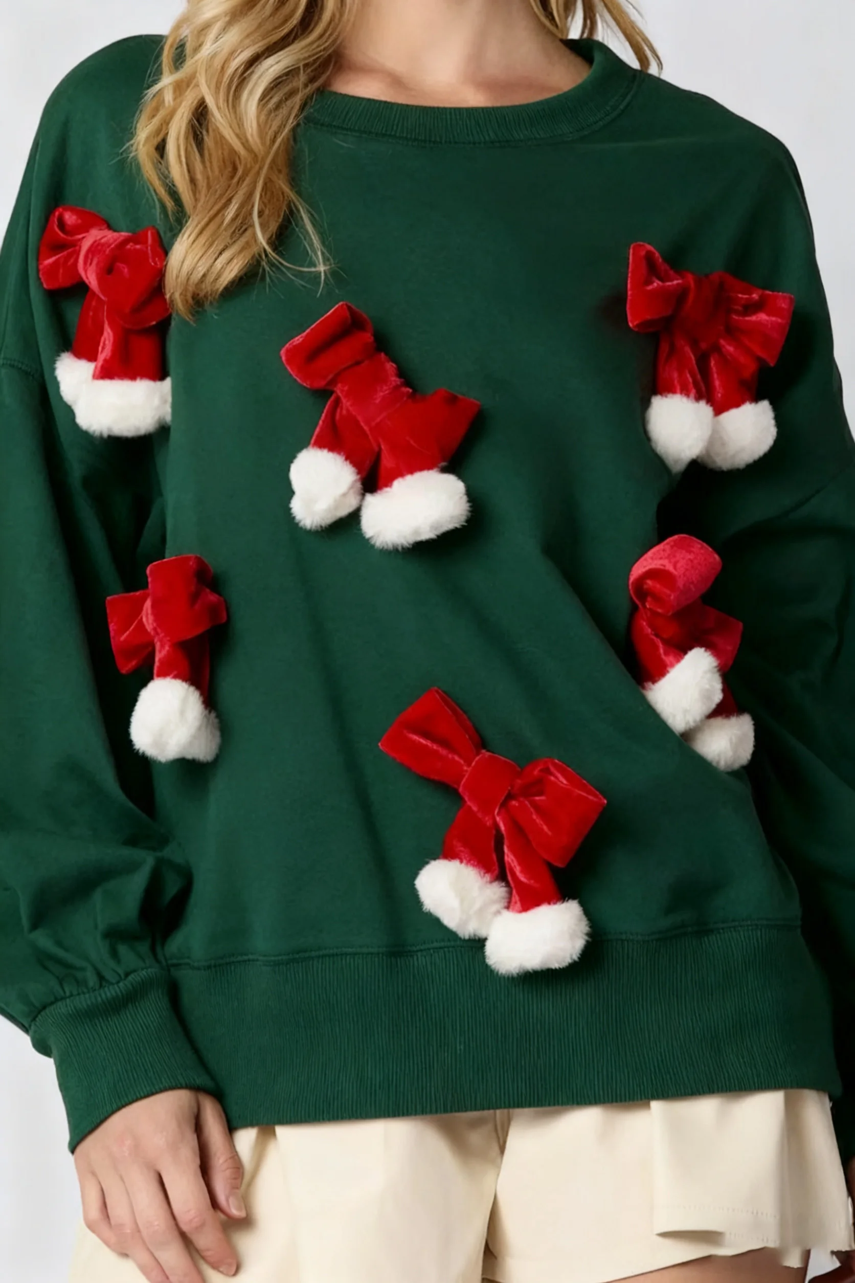 LYG Autumn Winter Collection European American Christmas Bow-Decorated Tops Casual Long-Sleeved Lined Printed