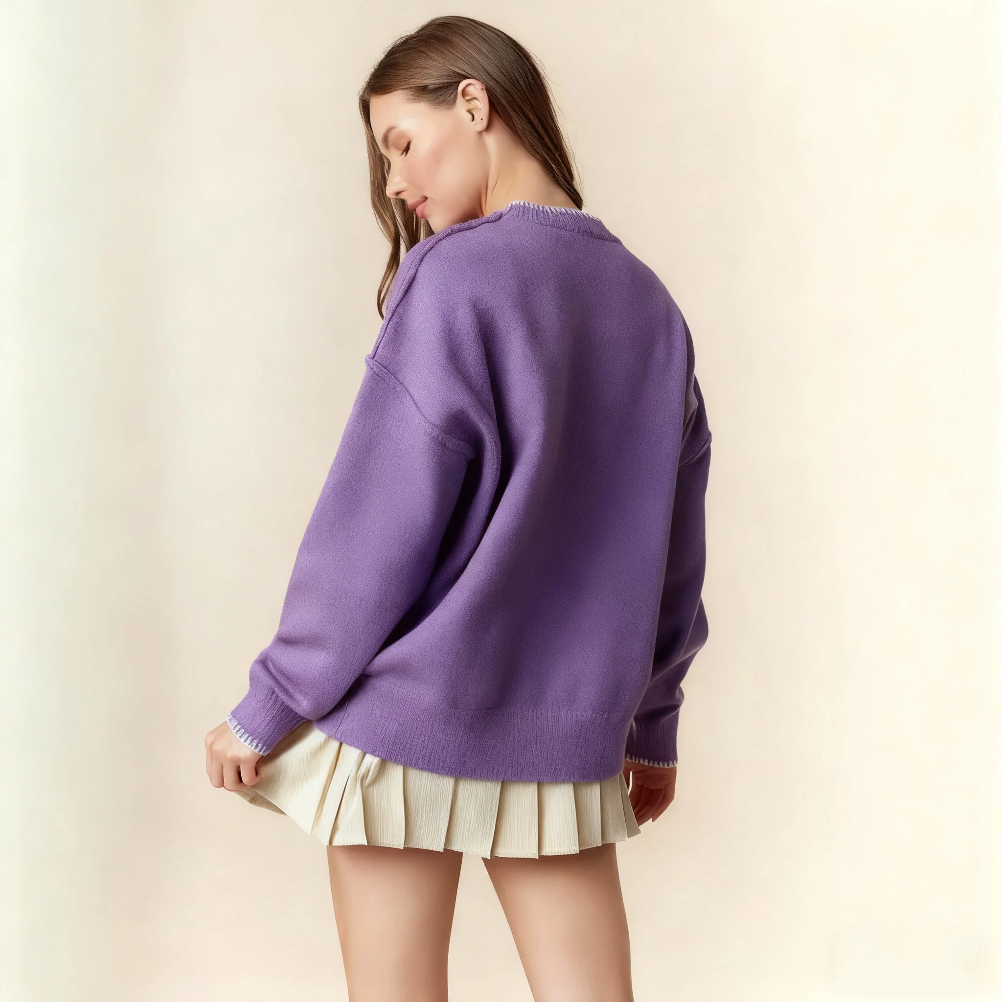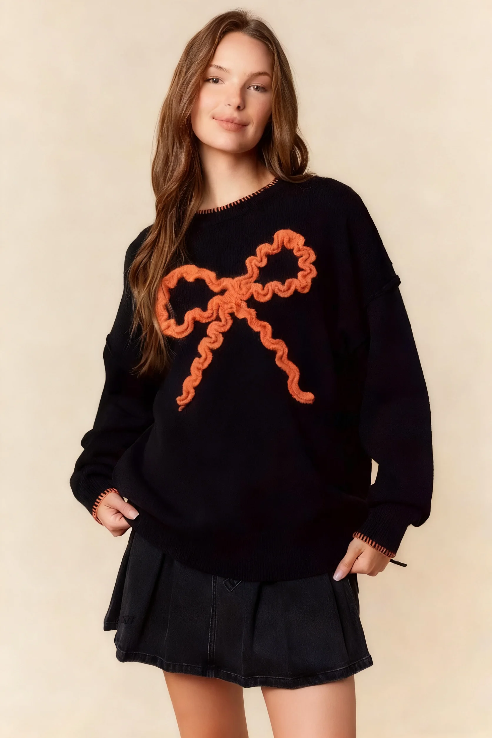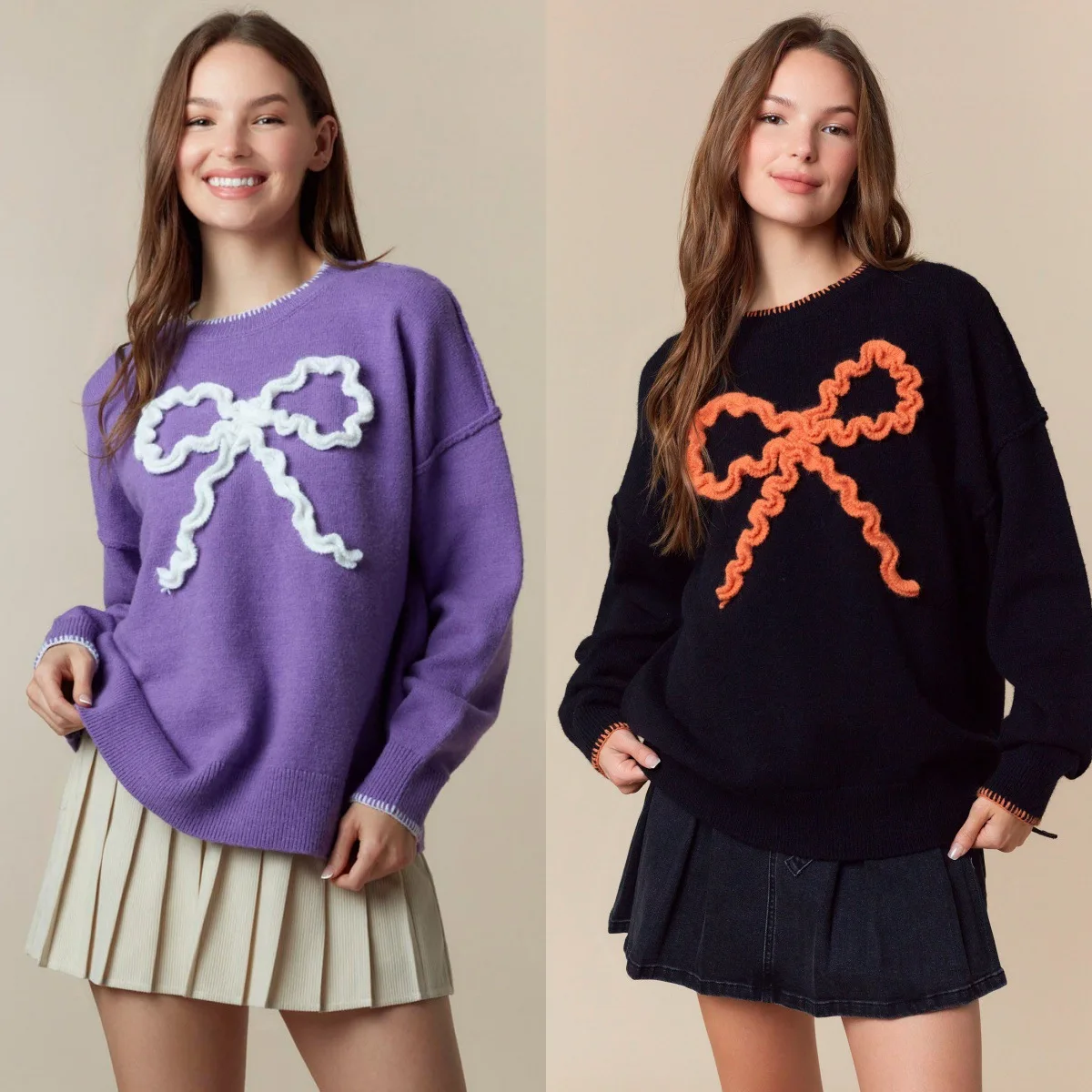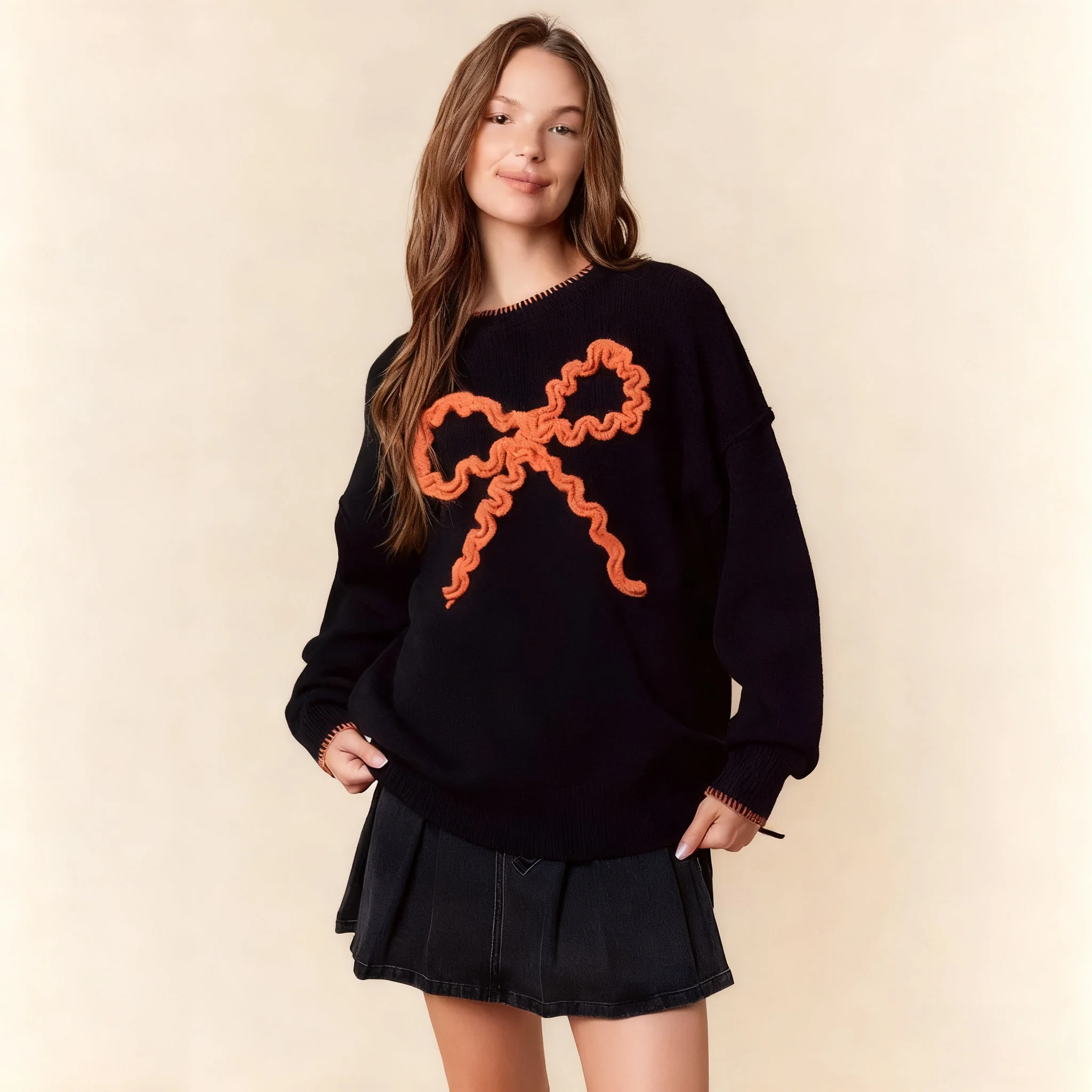 LYG New Design Autumn/Winter Women's Casual Knitted Sweater Top European American Style Bow Patchwork Long Sleeve Front Logo