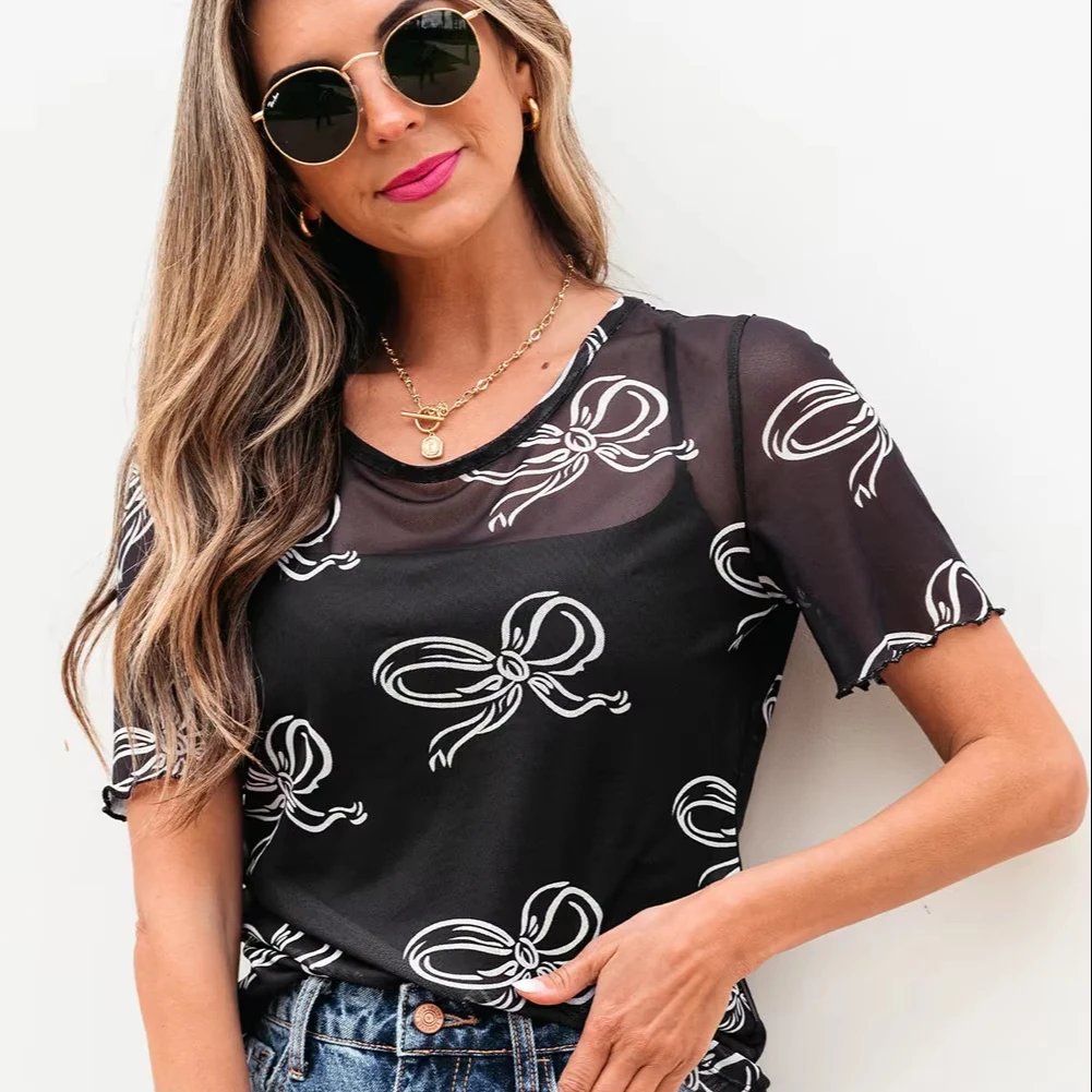 LYG Summer Bestseller Eco-Friendly Western Cowboy Aztec Print Top Mid-High Neck Fitted Base Compressed Short Sleeve Wholesale