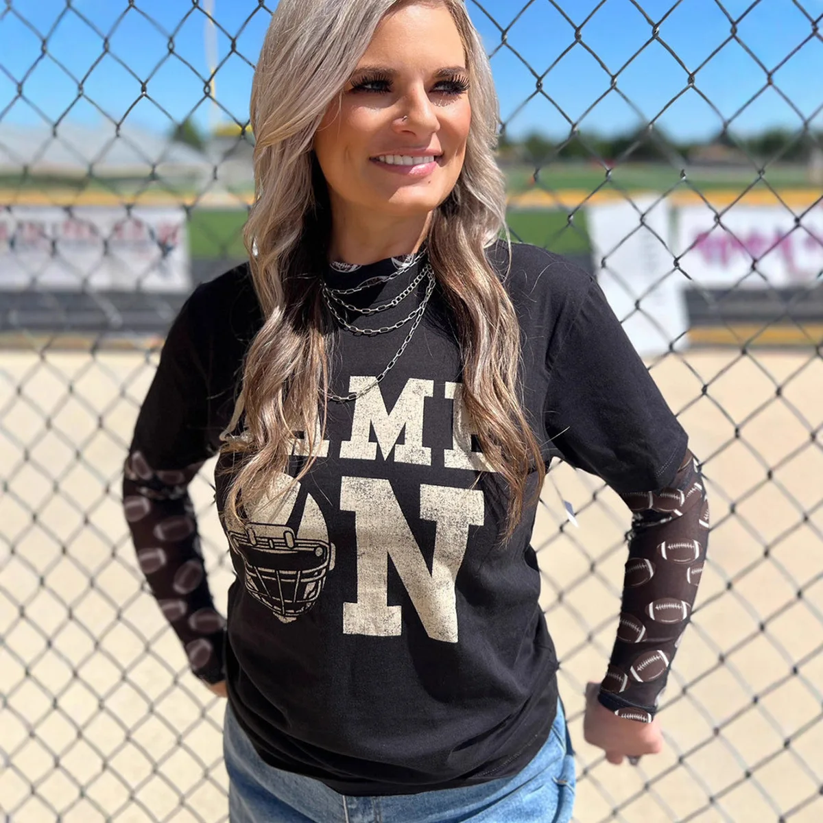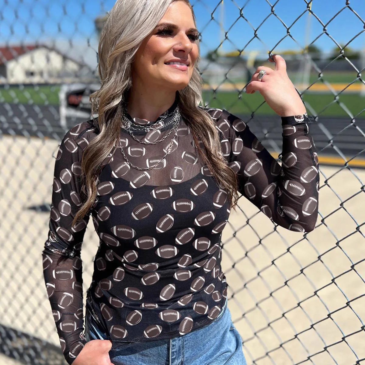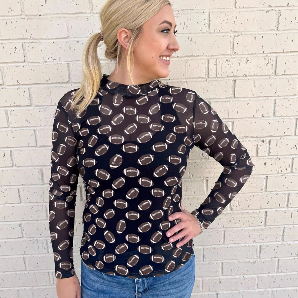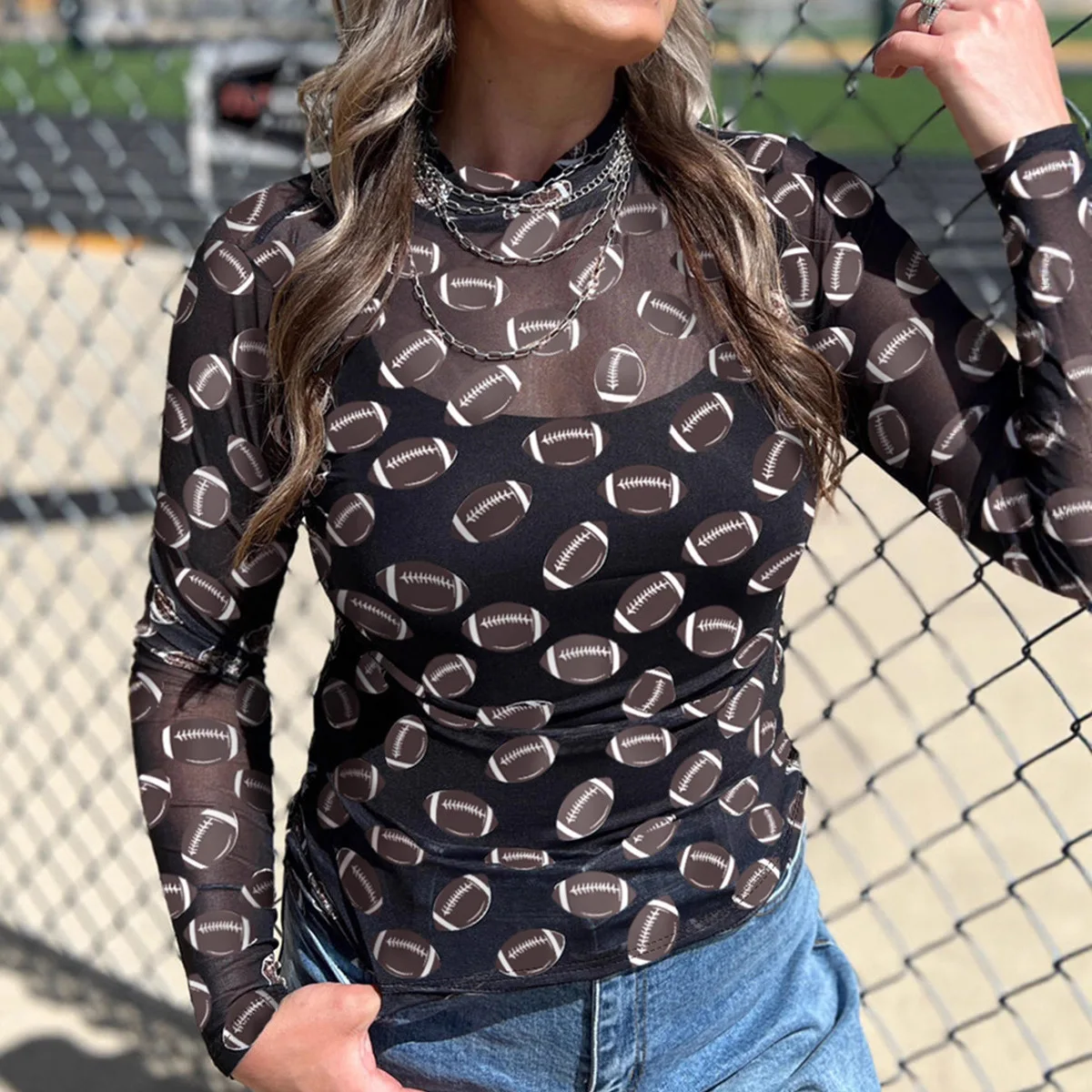 European American Style Casual Mesh Breathable Street Rugby Print Vintage Blouse Women 2026 Autumn Slim-Fit Long-Sleeve Top