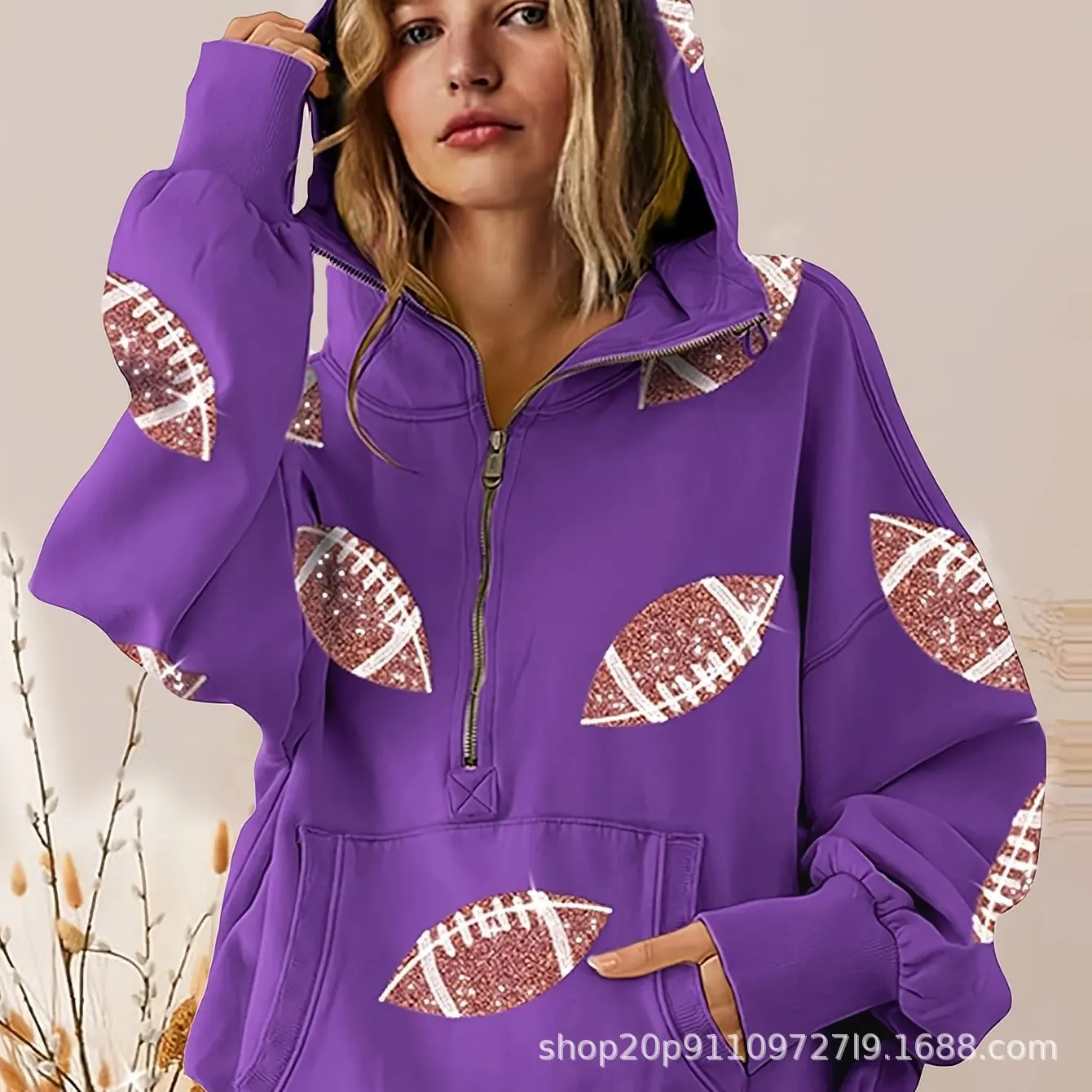 2026 Autumn Casual European American Women's Rugby Digital Print Knitted Hoodie Long Sleeve Half-Zip Pullover