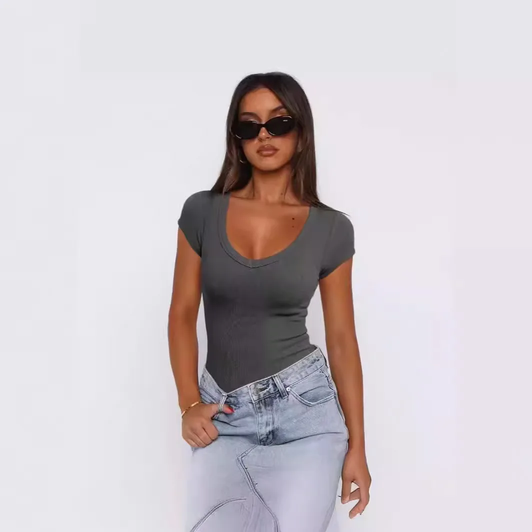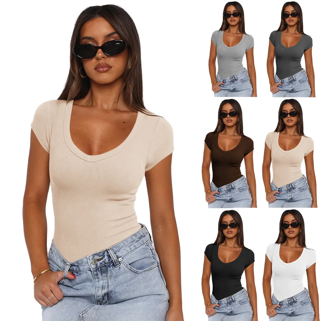 2026 Summer European American Fashion Women's Casual Ribbed Pullover Solid Color Short Sleeve Top Knitted Anti-Pilling T-Shirts