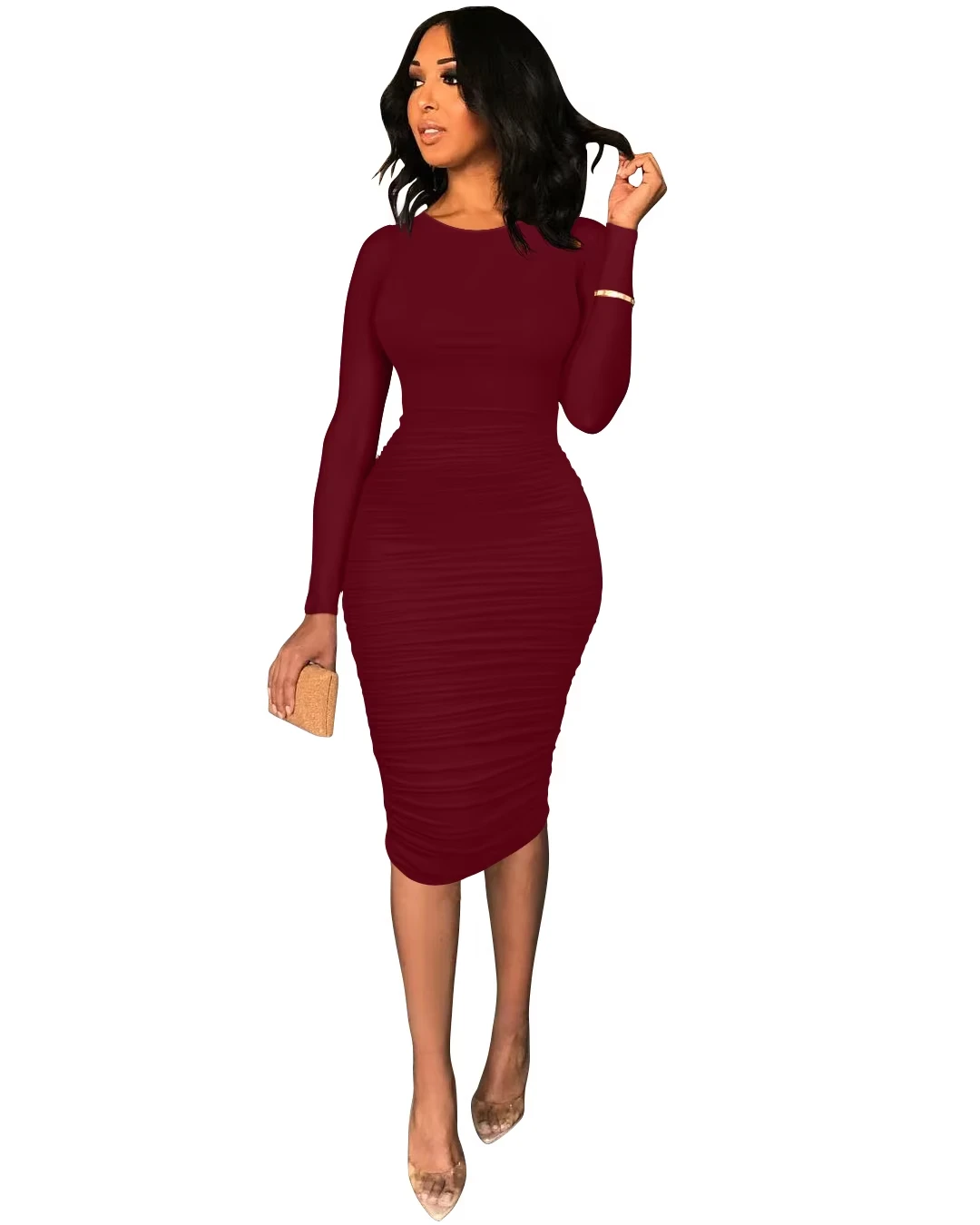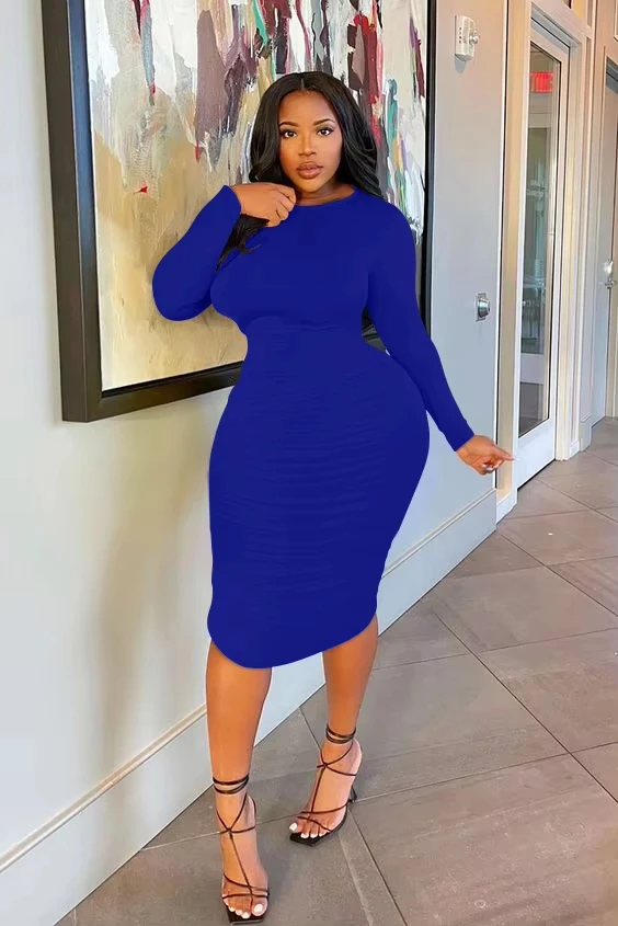 Autumn Casual Female Bodycon Midi Party Dresses Elegant Basic Long Sleeve Ruched Sexy Bodycon Natural Fashionable Straight