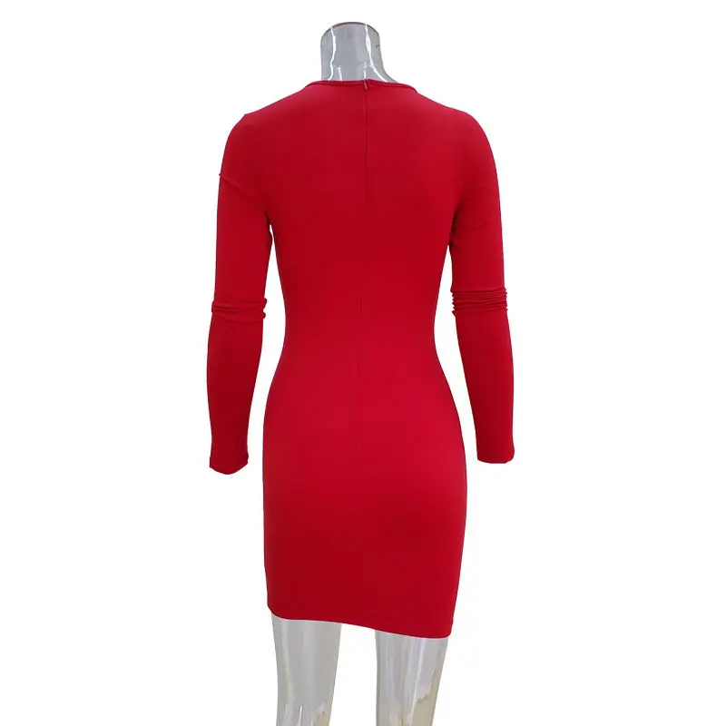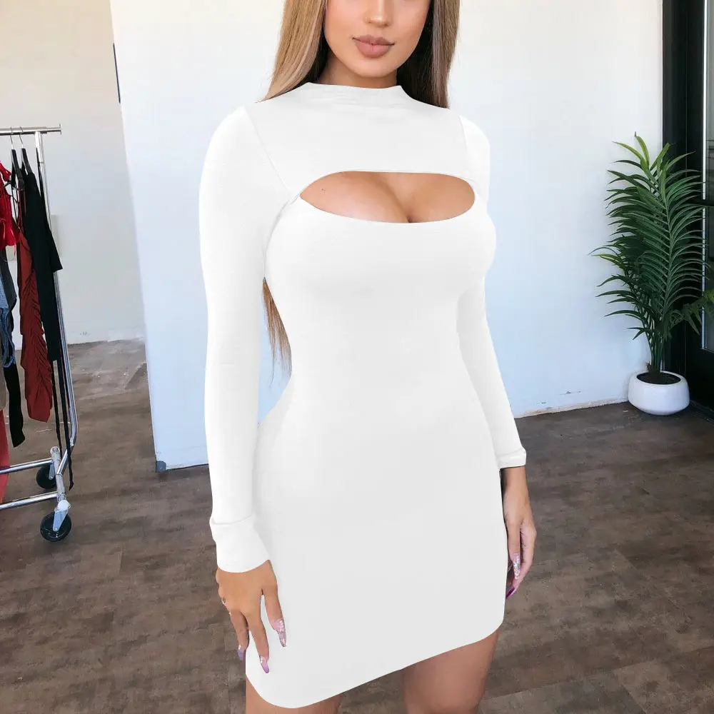 Ladies' Fashionable Sexy One-Piece Short Skirt Long Sleeves Solid Chest Hollow Hip Hugging Made Natural Spandex for Autumn