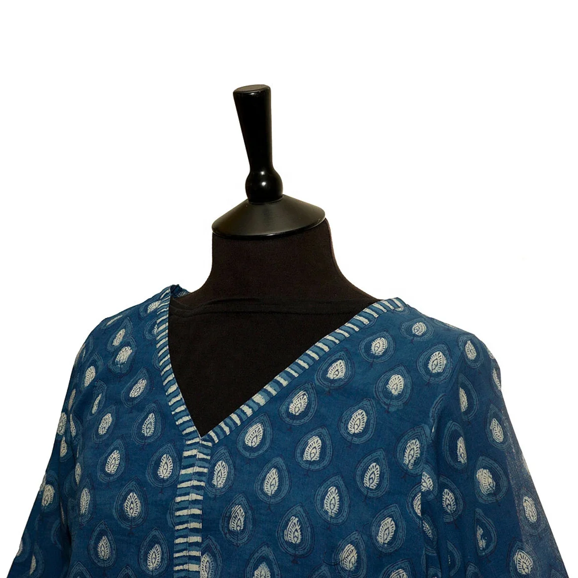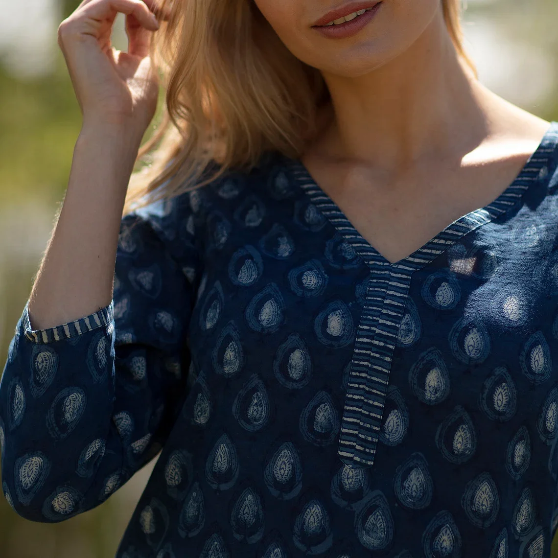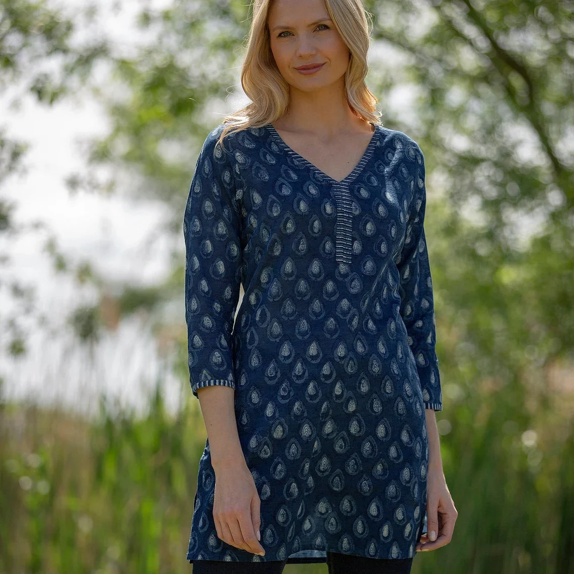 SALE Long KURTA TOP Style 2 Denim Blue with White Motif 100% Lightweight V-neck Long Sleeve Top For Women Gift For Her