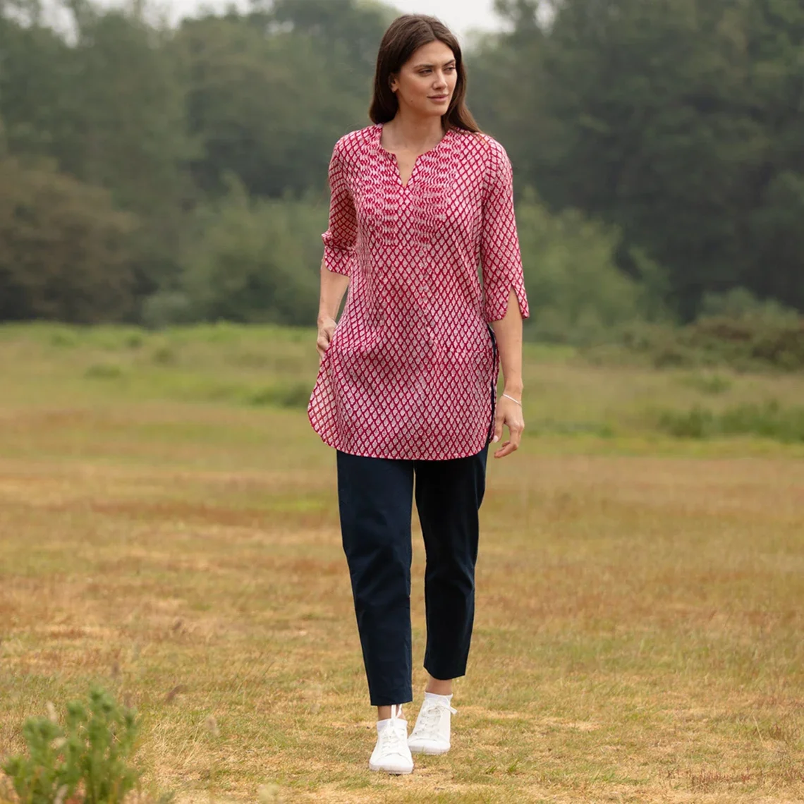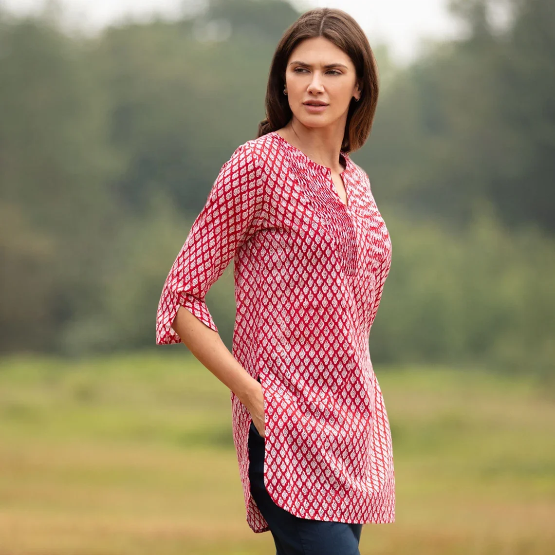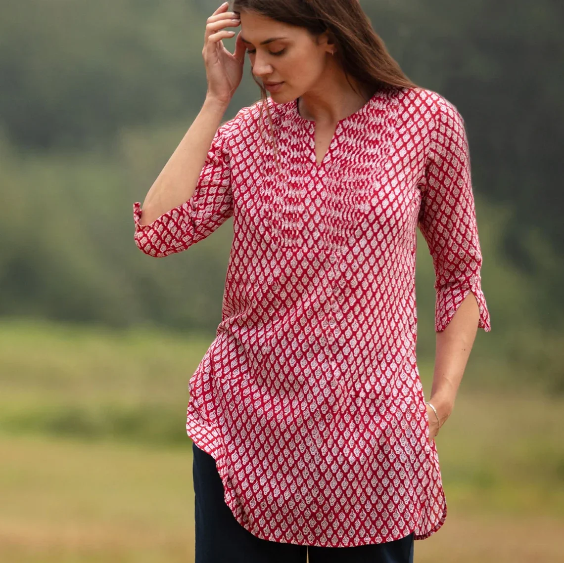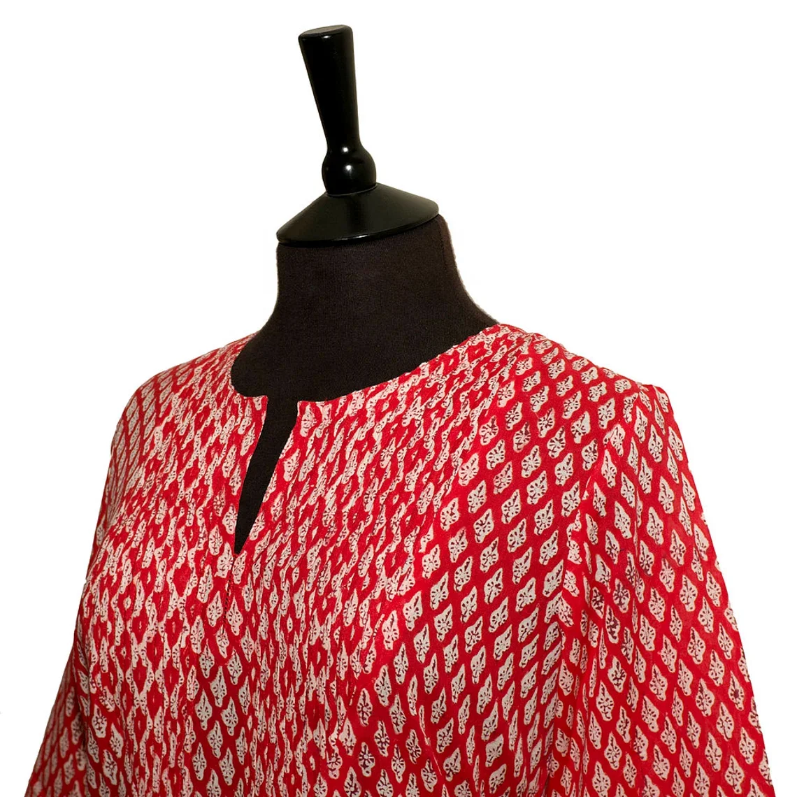 SALE Long KURTA TOP Style 3 Bright Red with White Motif 100% Cotton Block Printed Pintuck V-neck Long Sleeve Casual Top