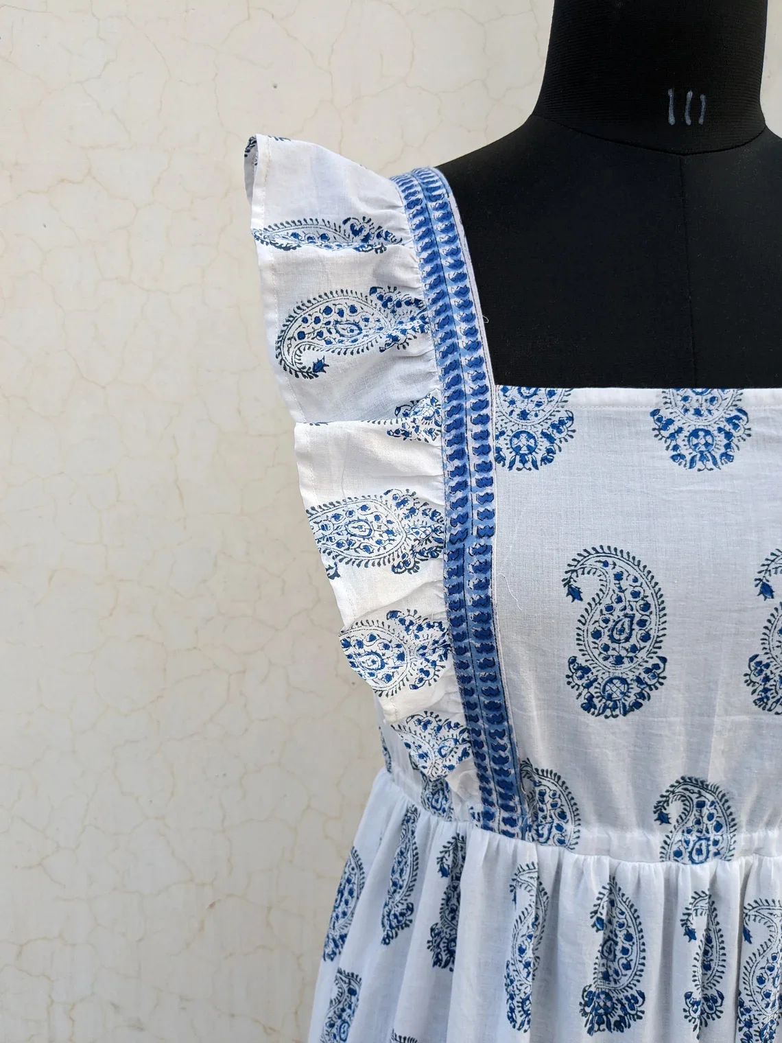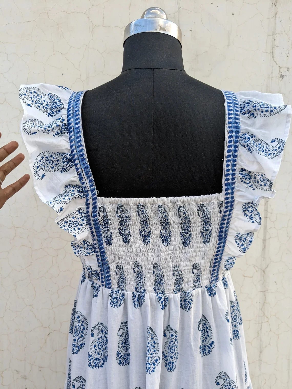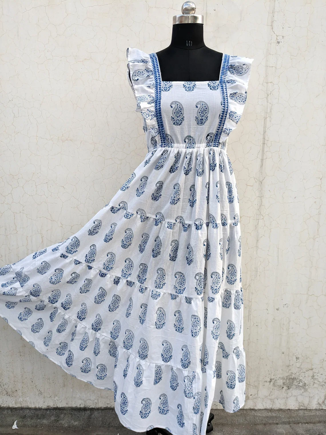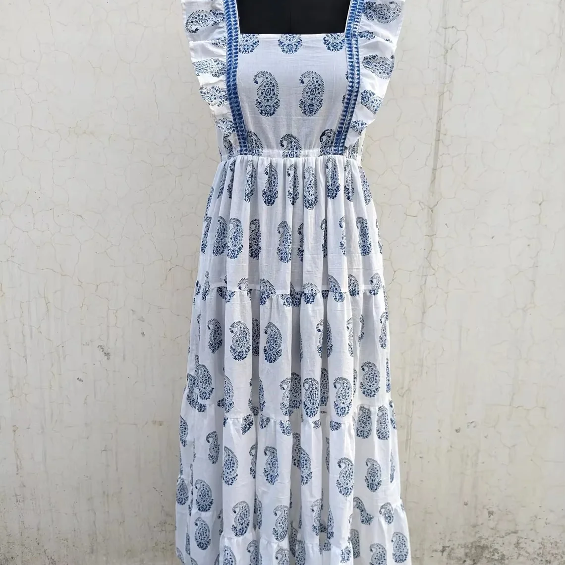 Indian Cotton Linen Maxi Dress Hand Block Printed Breathable Summer Costume with White Tiered Gift for Her Natural Waistline