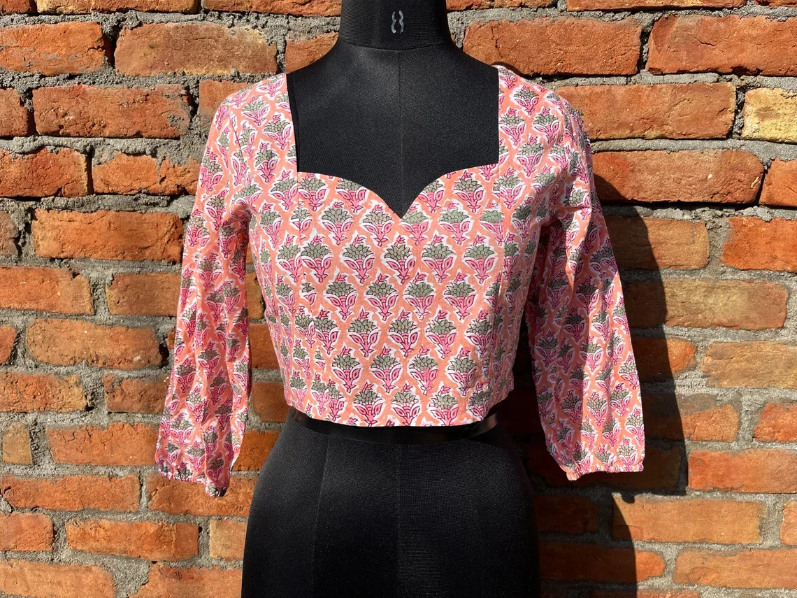 Hand Block Printed Cotton Blouse for Women Summer V-Neck Tank Top with Embroidered Casual Party Wear V-neck Top