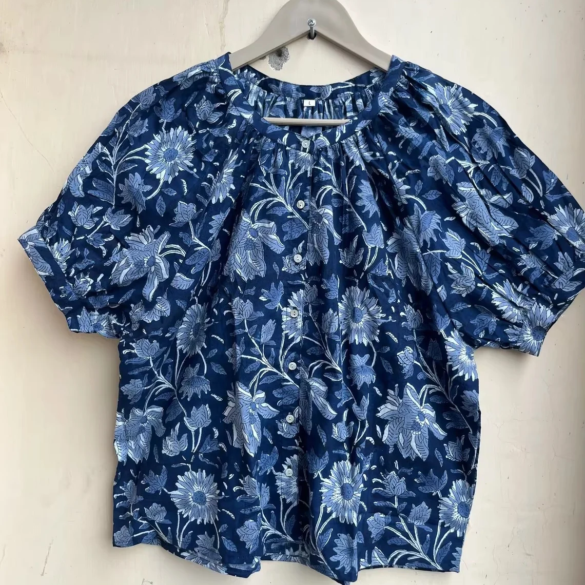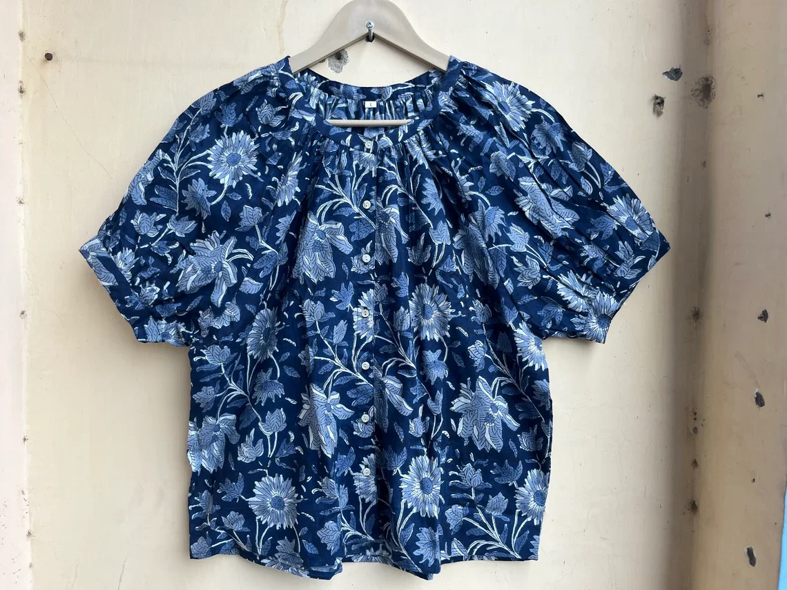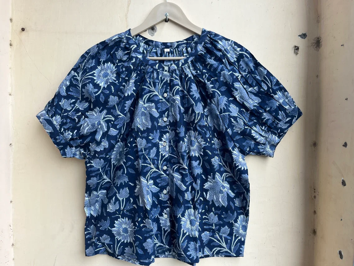 Hand Block Printed Top Summer Cotton Top Women Top Handmade Cotton Blouse Floral Print O-neck Short Sleeve Casual Top