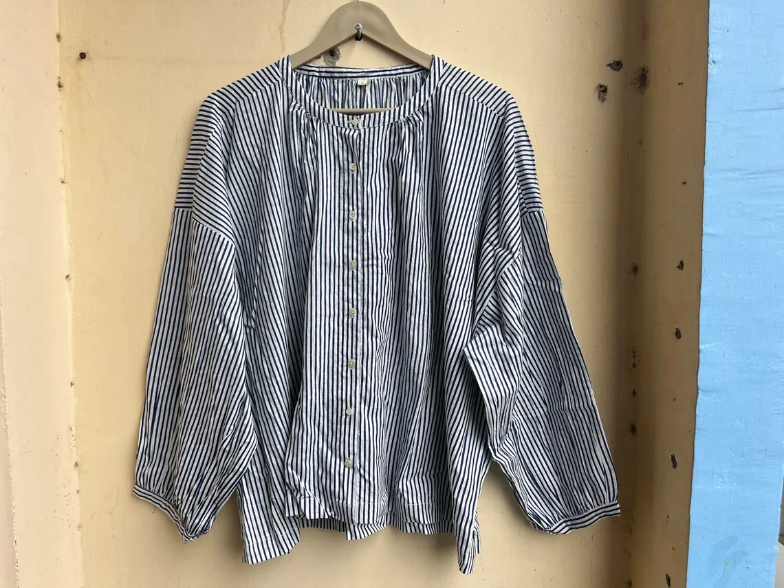 Hand Block Printed Top Summer Cotton Top Women Top Handmade Cotton Blouse Round Neck Linen Cotton Long Sleeve Top Gift For Her