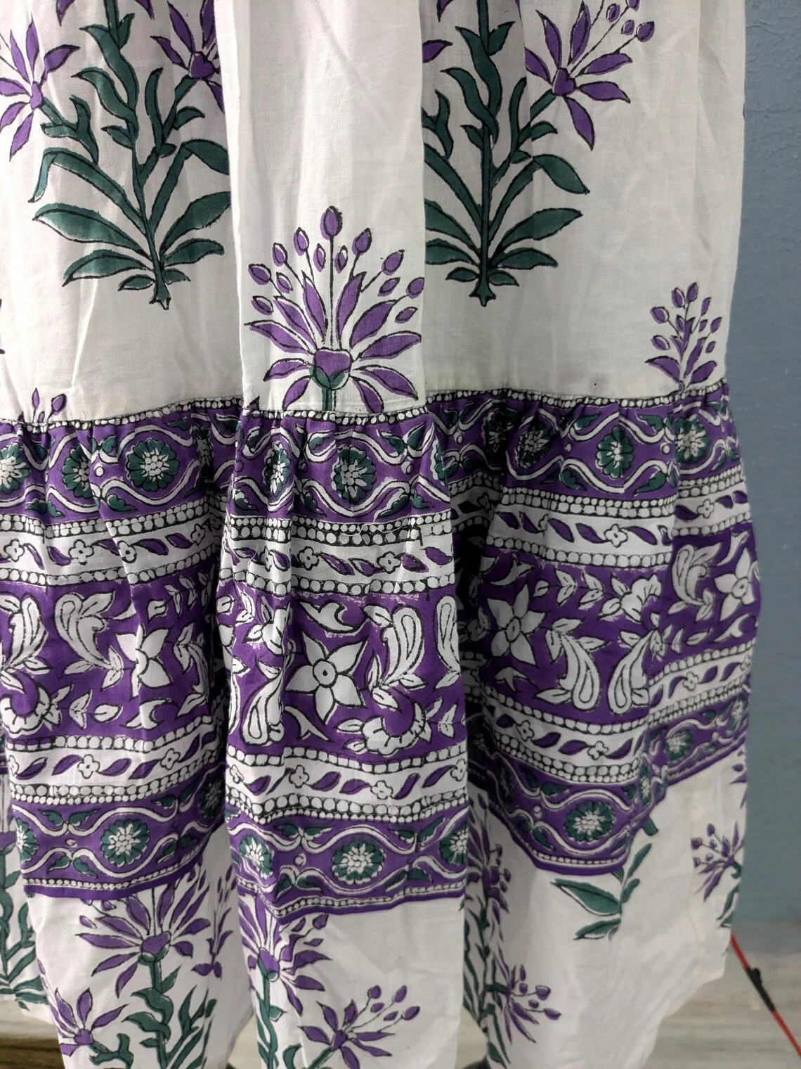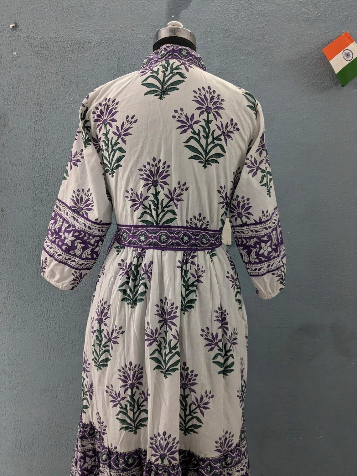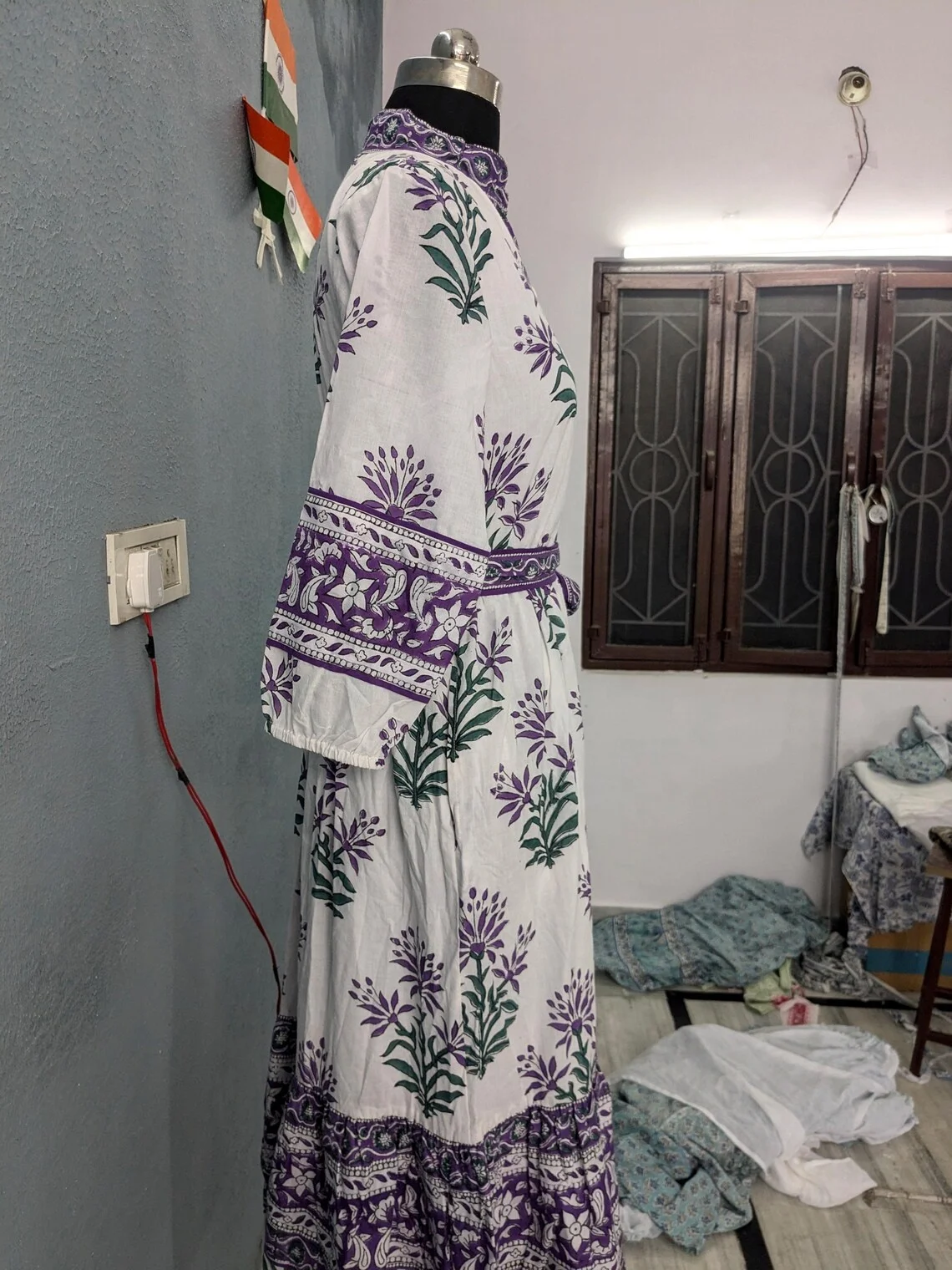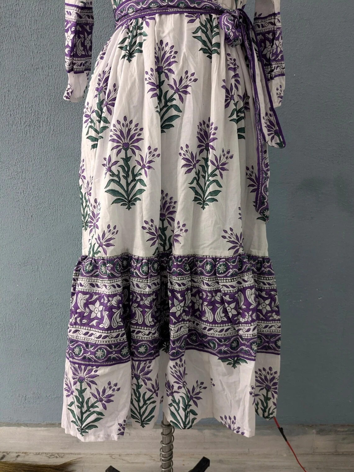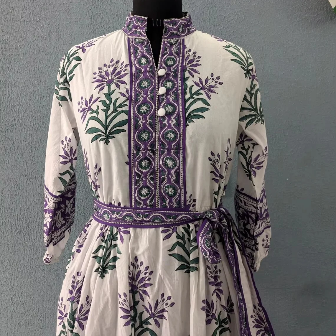 Hand Block Print Cotton Linen Floral Dress V-neck Long Sleeve Casual Long Maxi Gown Partywear Long Dress For Women