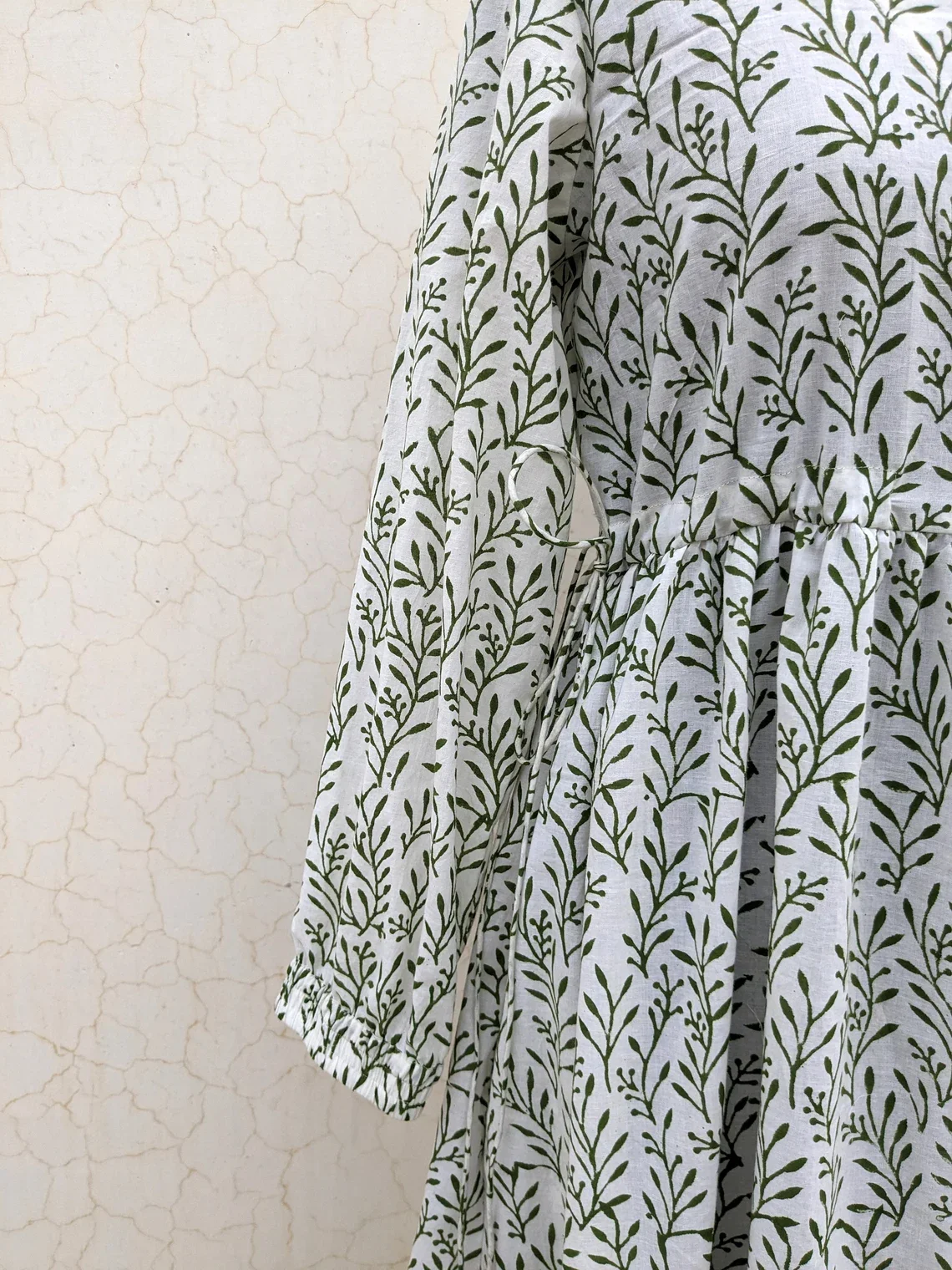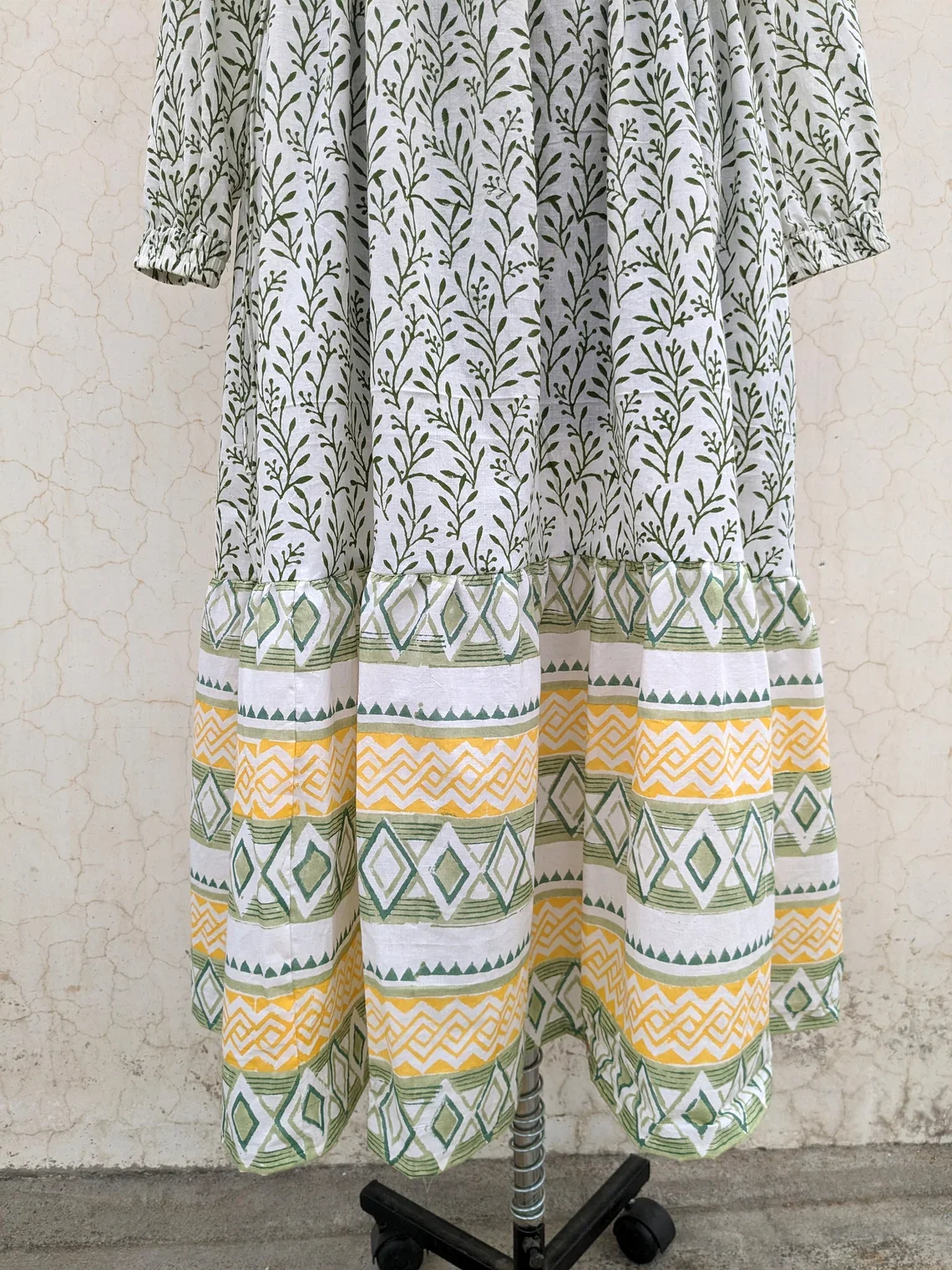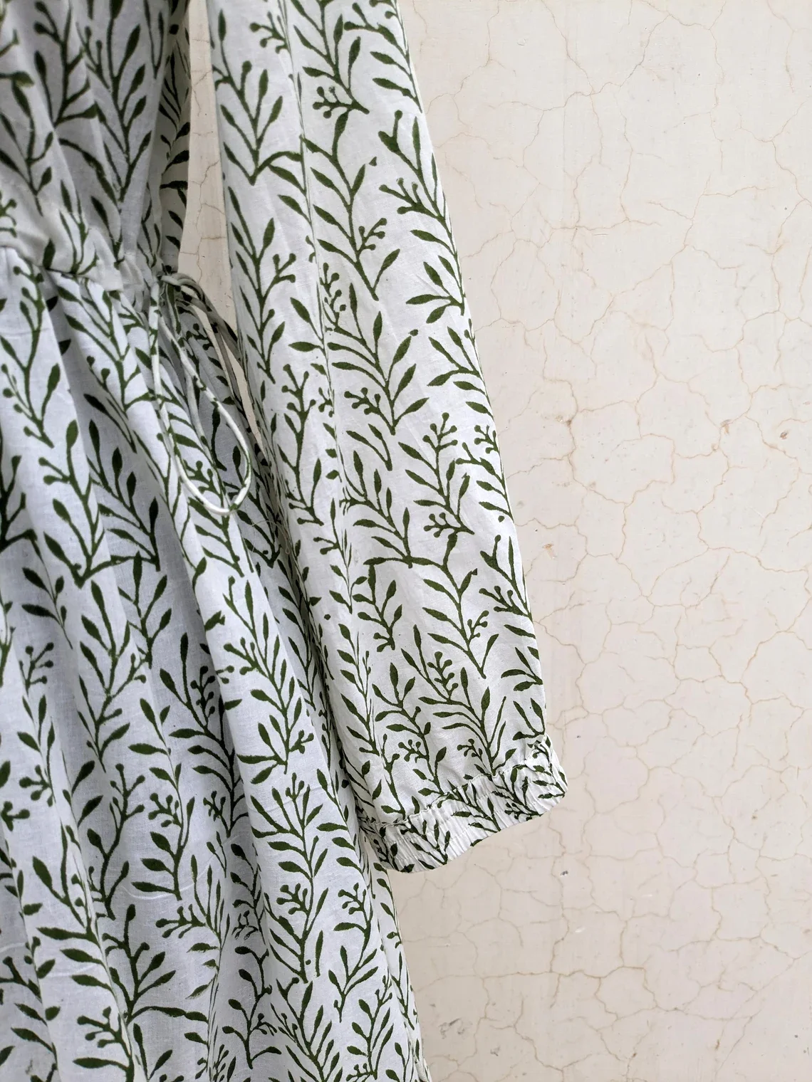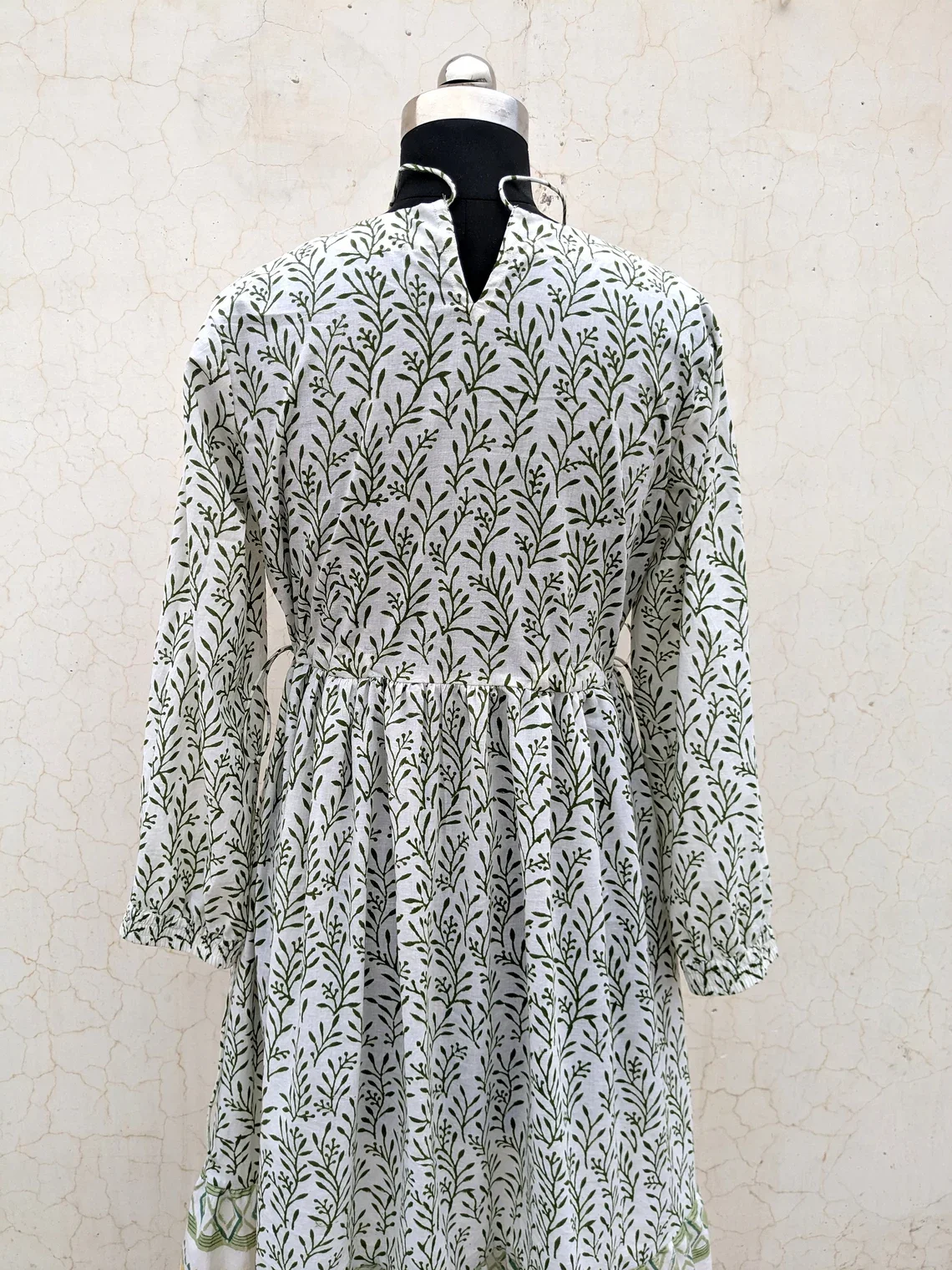 Hand Block Printed Maxi Dress Solid & Floral Pattern V-neck Long Sleeve Indian Tunics Style Long Maxi Dress For Women