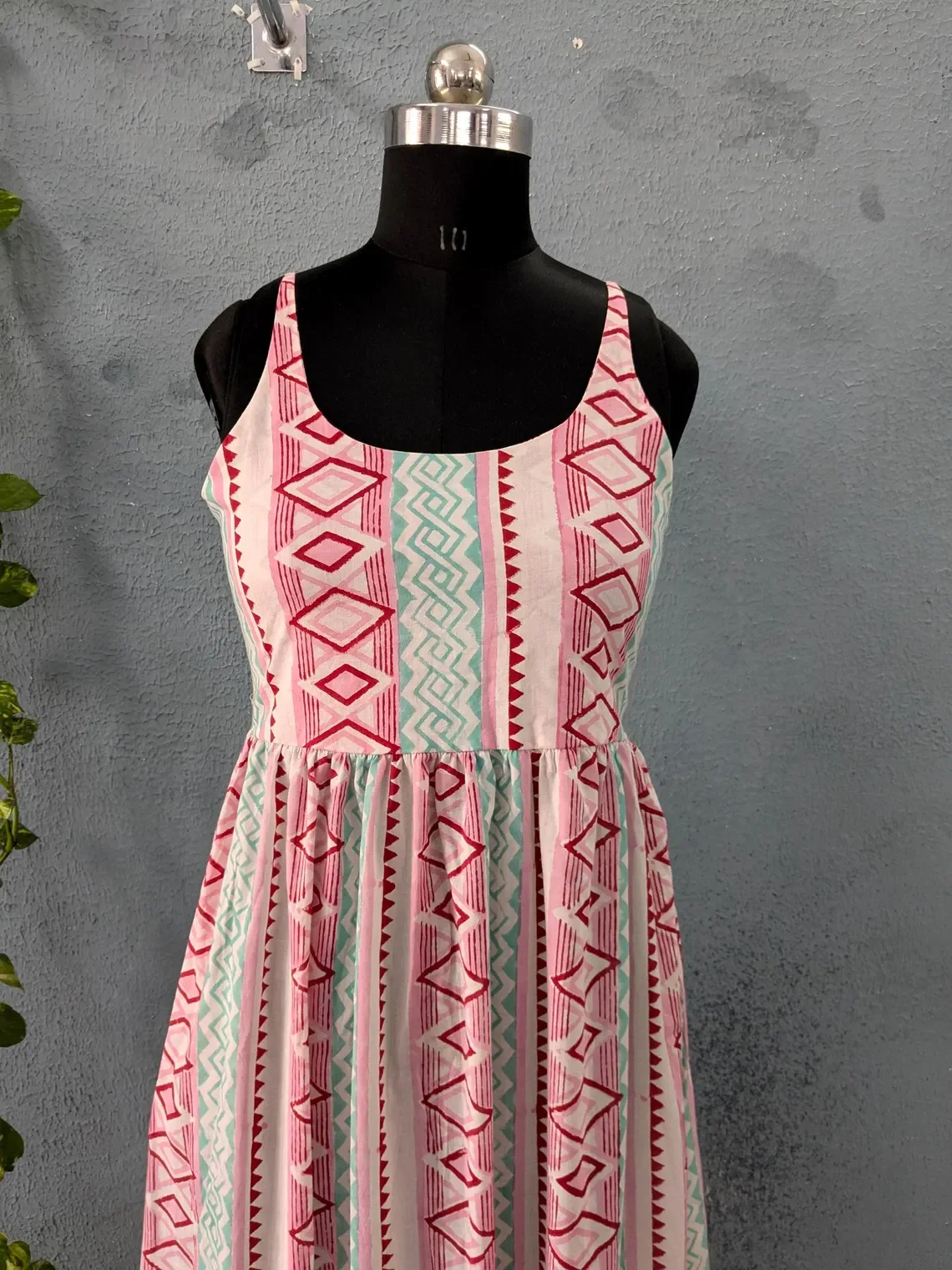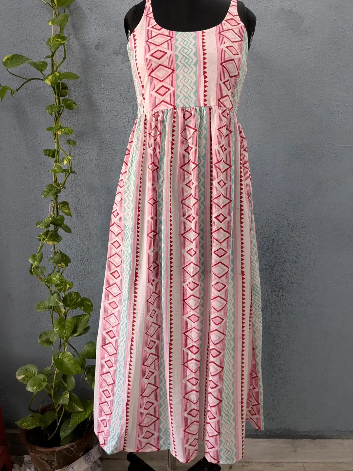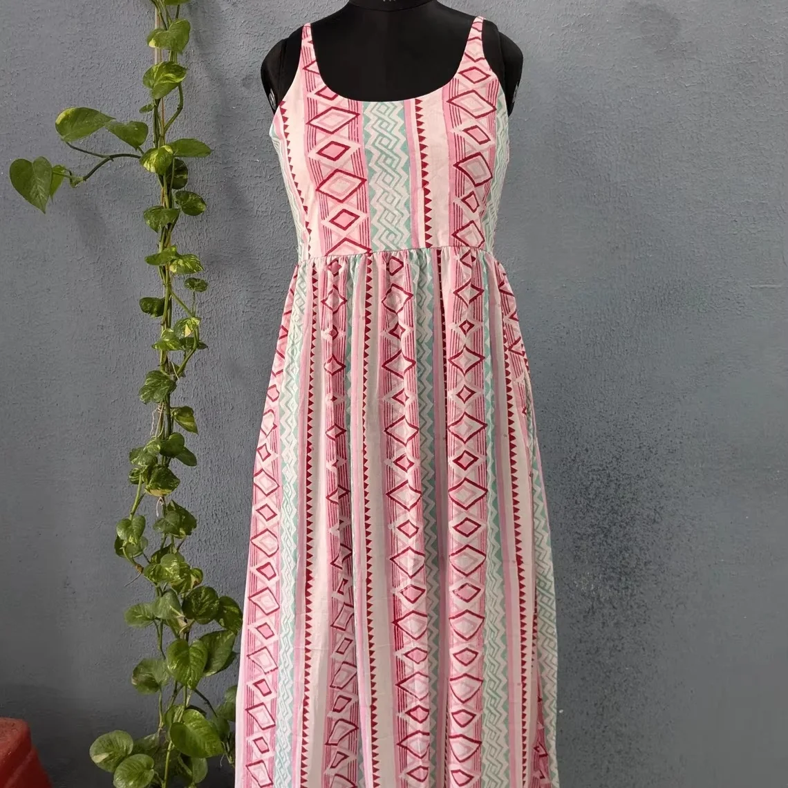 Handmade 100% Cotton Women Lightweight Block Print Round Neck Sleeveless Long Maxi Dress For Summer Season