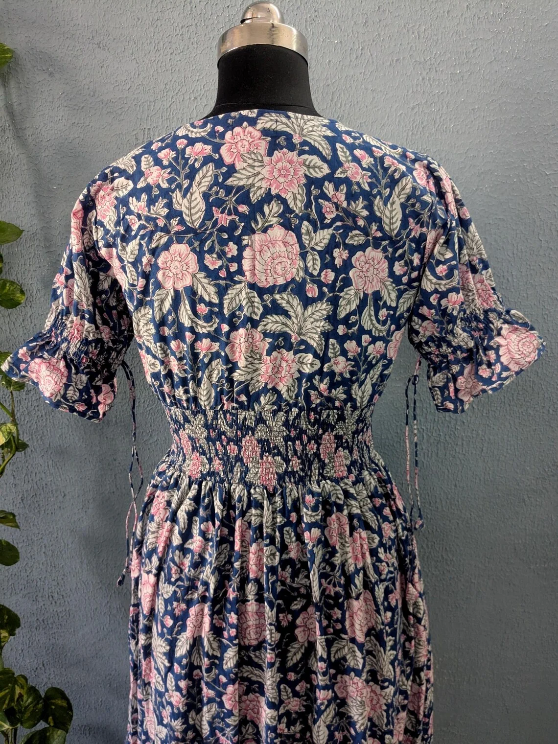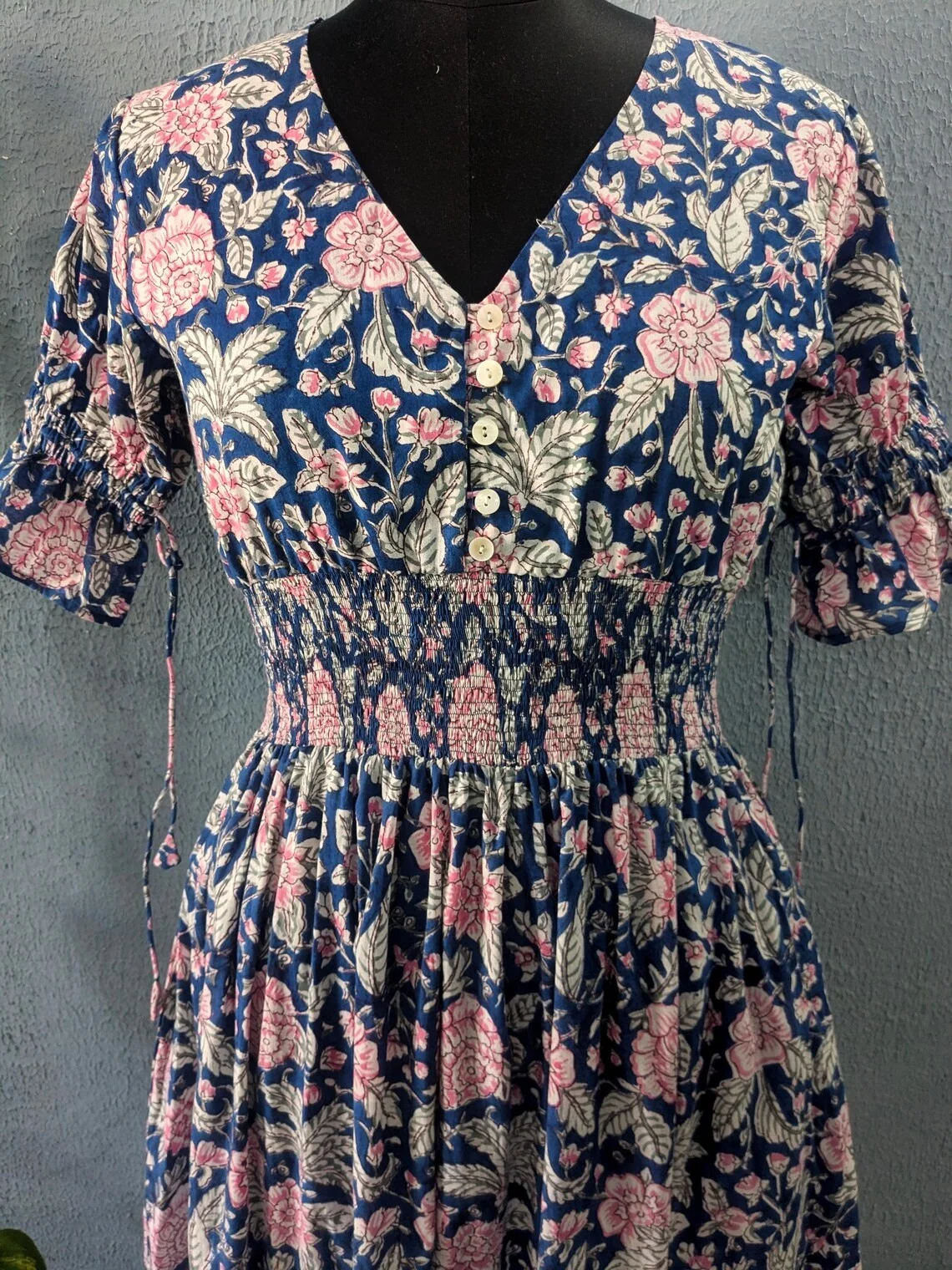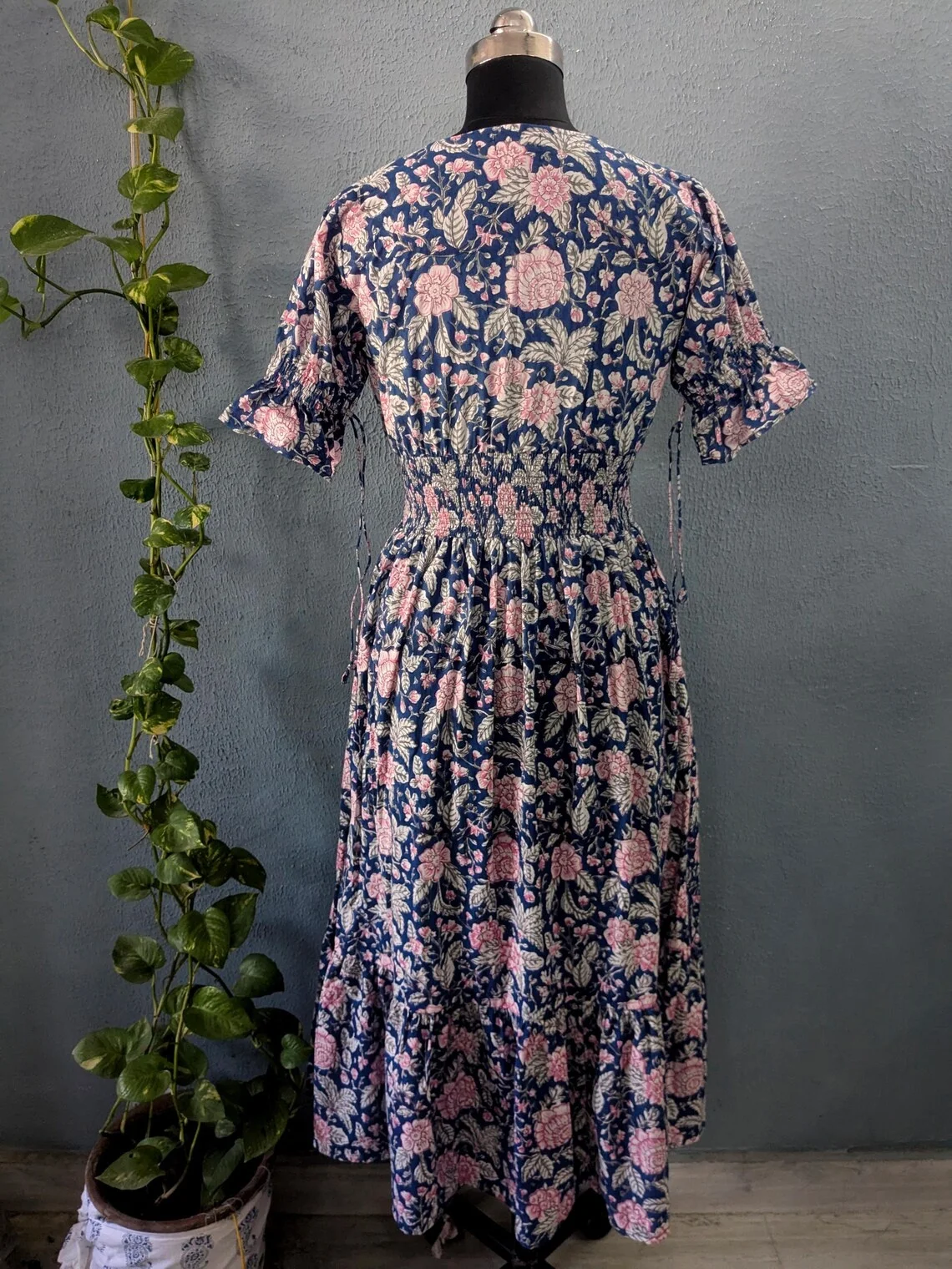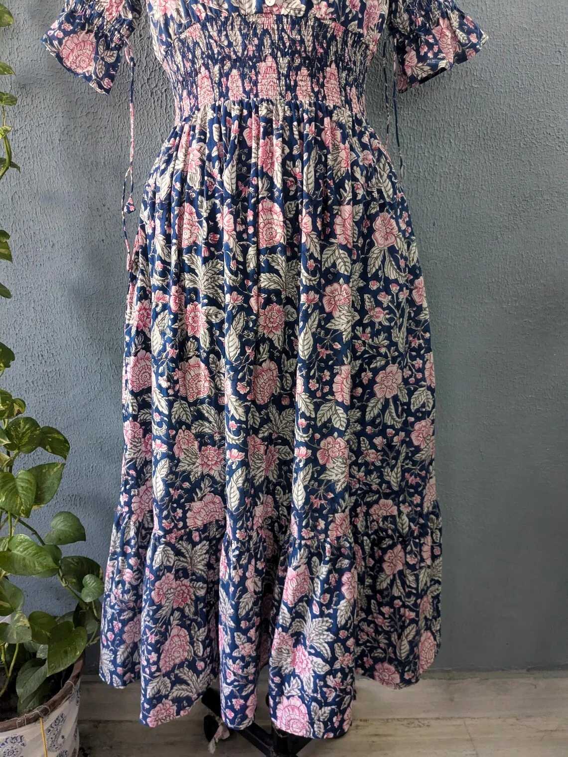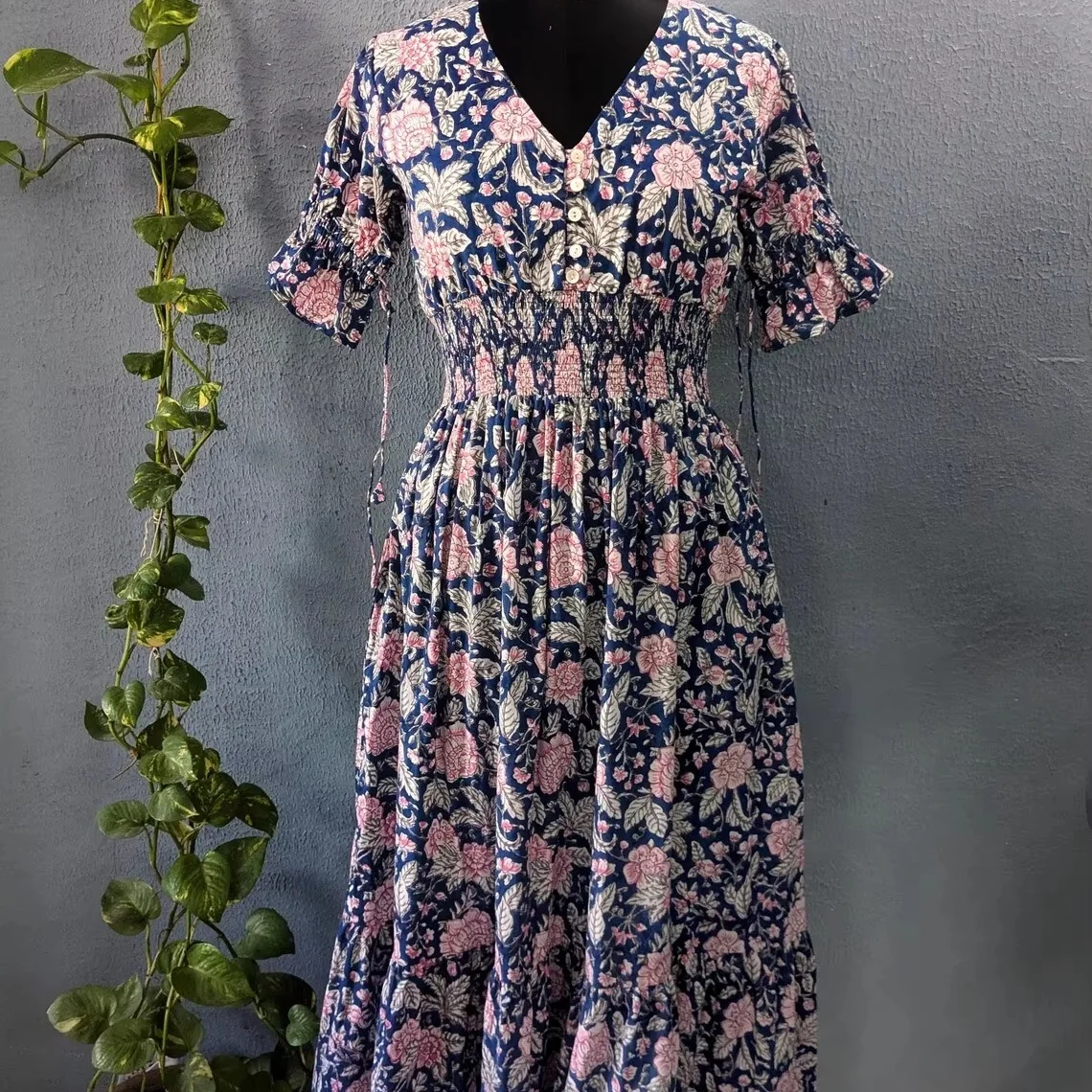 Ethical & Sustainable Summer Maxi Dress Hand Block Printed Floral Pattern V-neck Puff Sleeve Tiered Organic Cotton Long Dress
