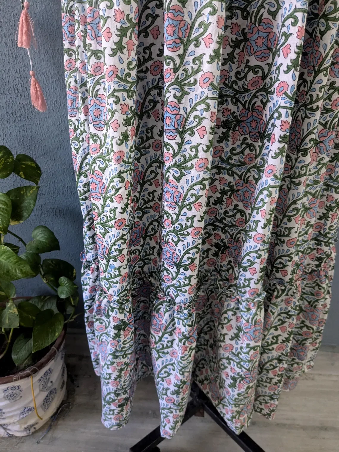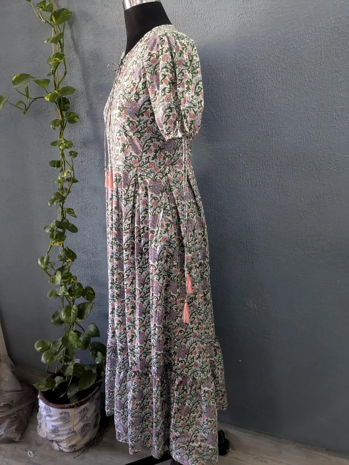 Hand Block Printed Solid Cotton Gown Puff Sleeve Mandarin Collar 100% Indian Cotton Long Maxi Dress For Women
