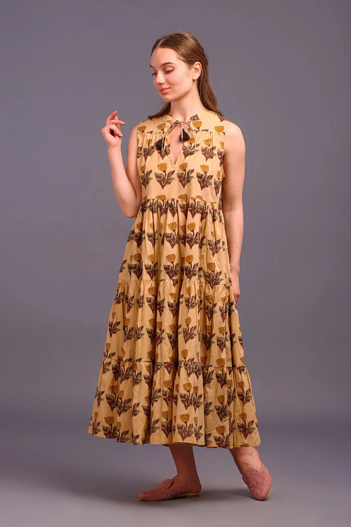 Women's Hand-Block Printed Cotton Dress Solid Pattern Maxi Length Tier Dress Made From 100% Cotton Autumn/Summer Season